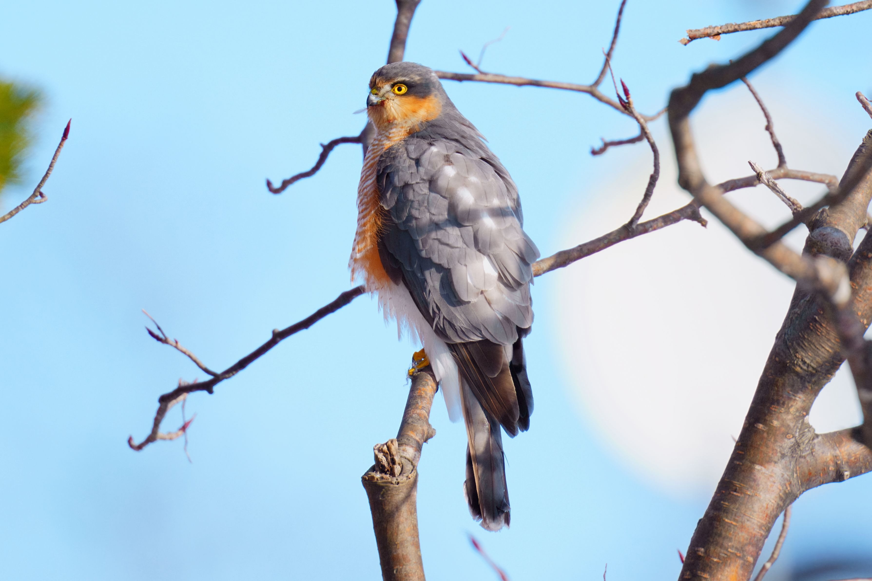 シマエナガちゃんを撮影するため望遠レンズを担いで歩いていると、民家の庭にハイタカさんがいらっしゃいました。最初は後ろ向きだったので、ヒヨドリかなと思いきや、振り向くと猛禽類特有の凛々しいお顔を見せてくれました。