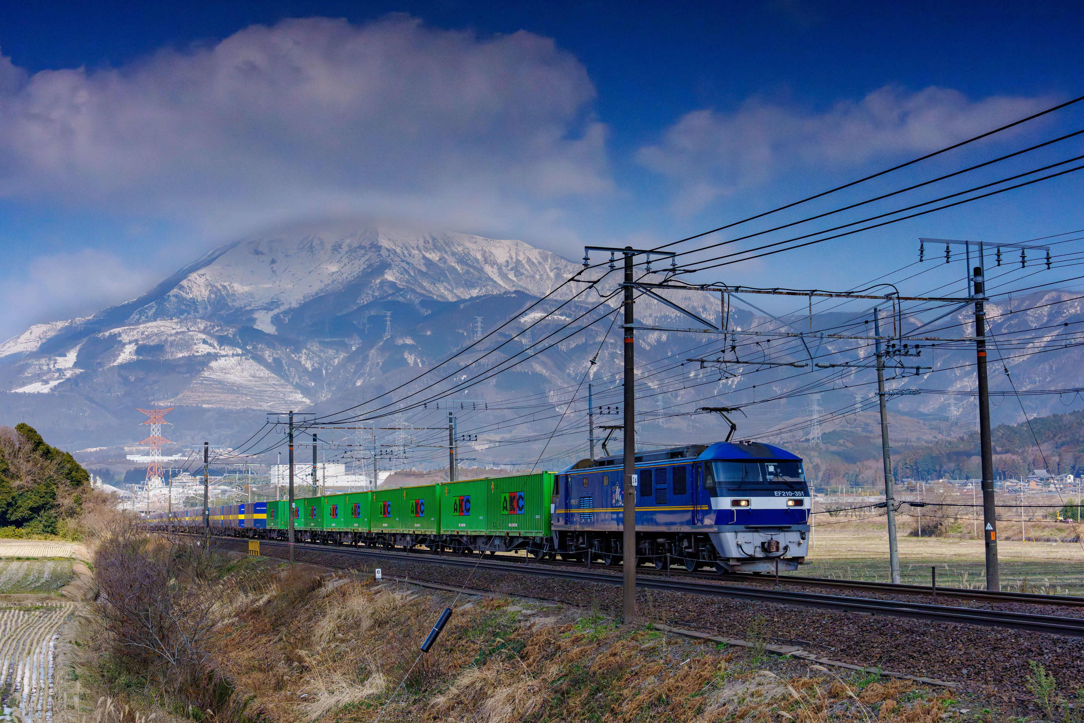 ★雪の伊吹山とEF210形電気機関車★ 愛称 ECO-POWER 桃太郎が牽引する東海道線貨物列車が近江長岡駅と柏原駅の間の清武踏切を通過していくところを撮影しました。雪化粧をした伊吹山を背に、大動脈東海道の貨物輸送を担ってくれていました。