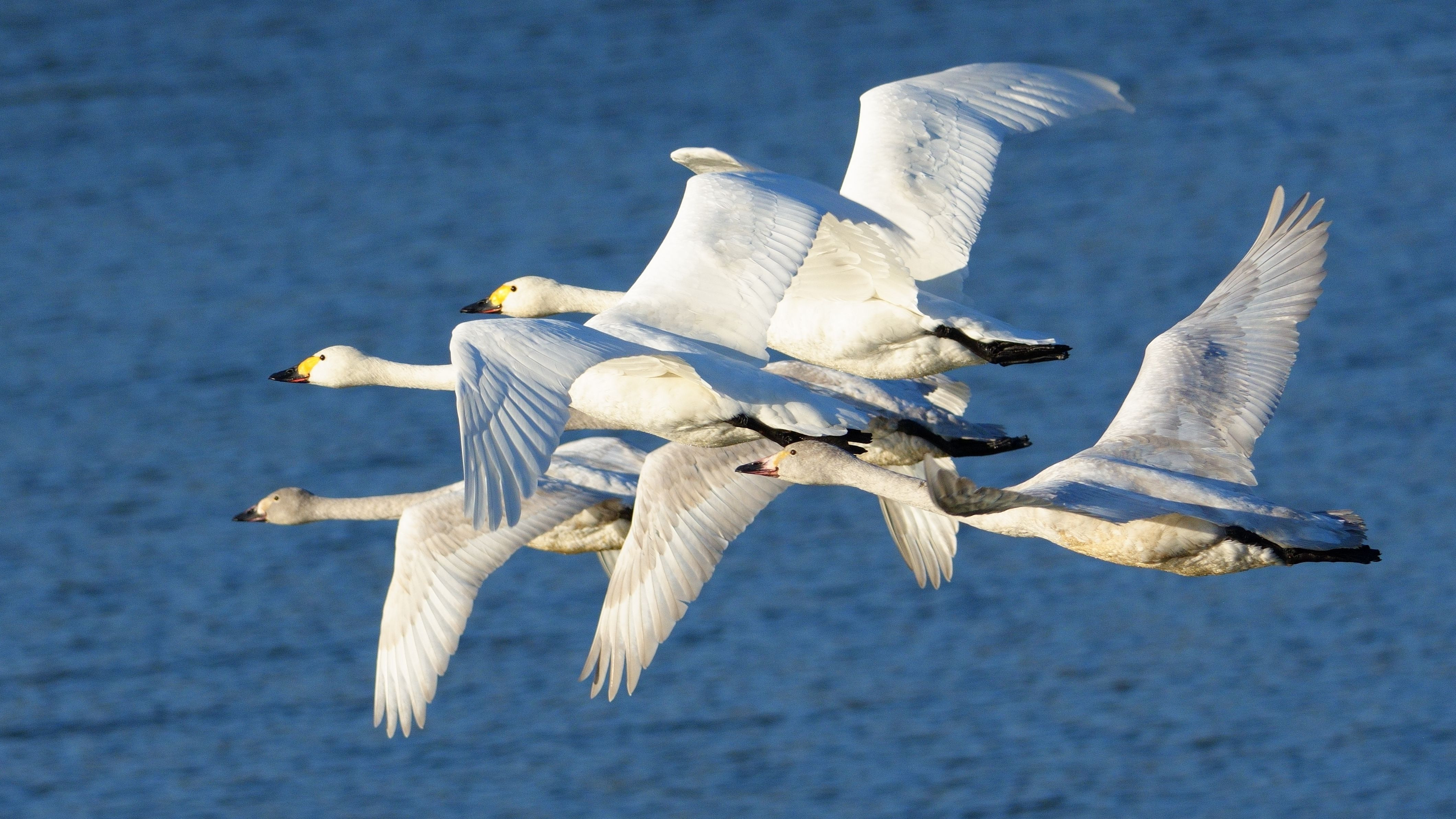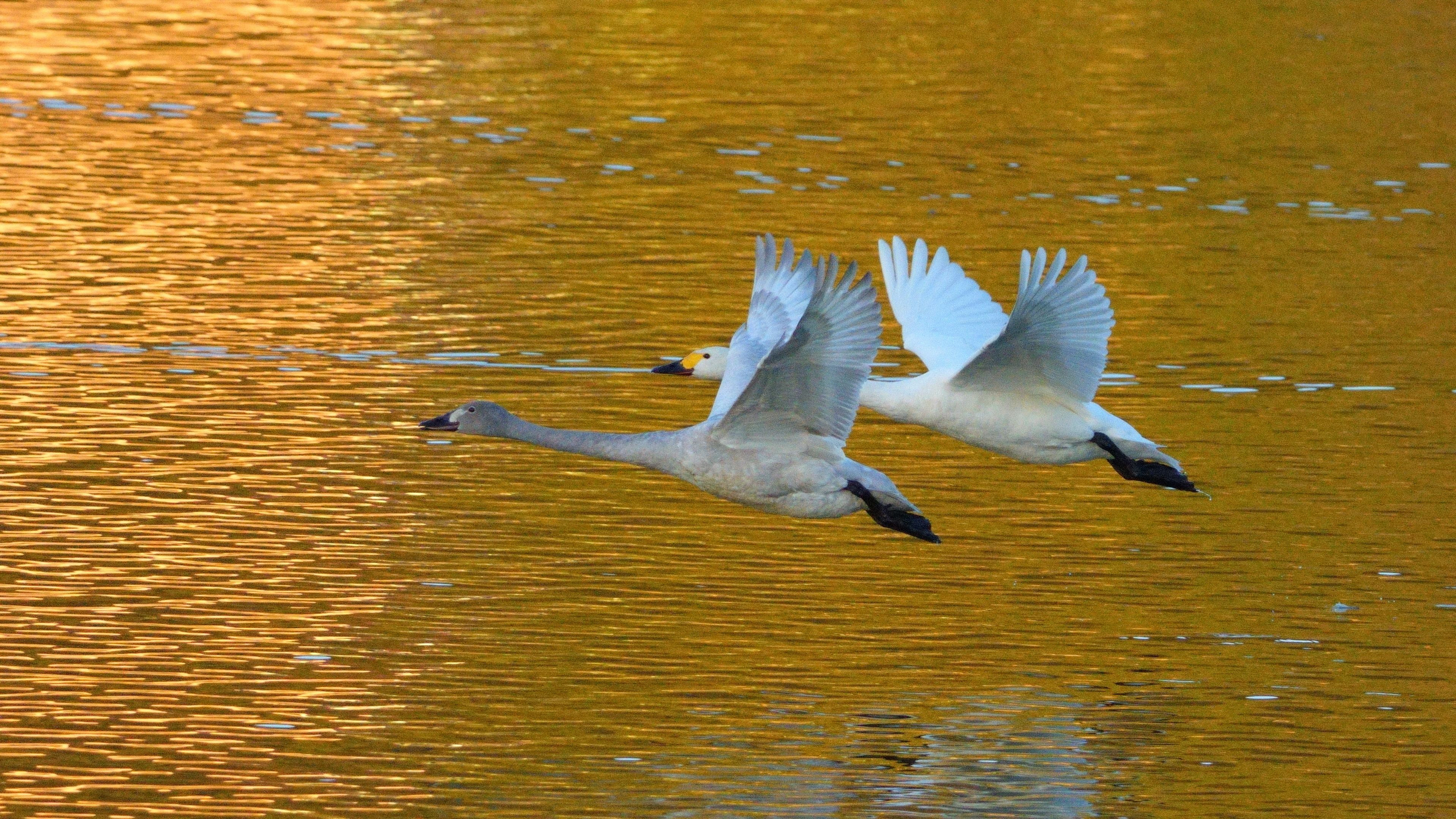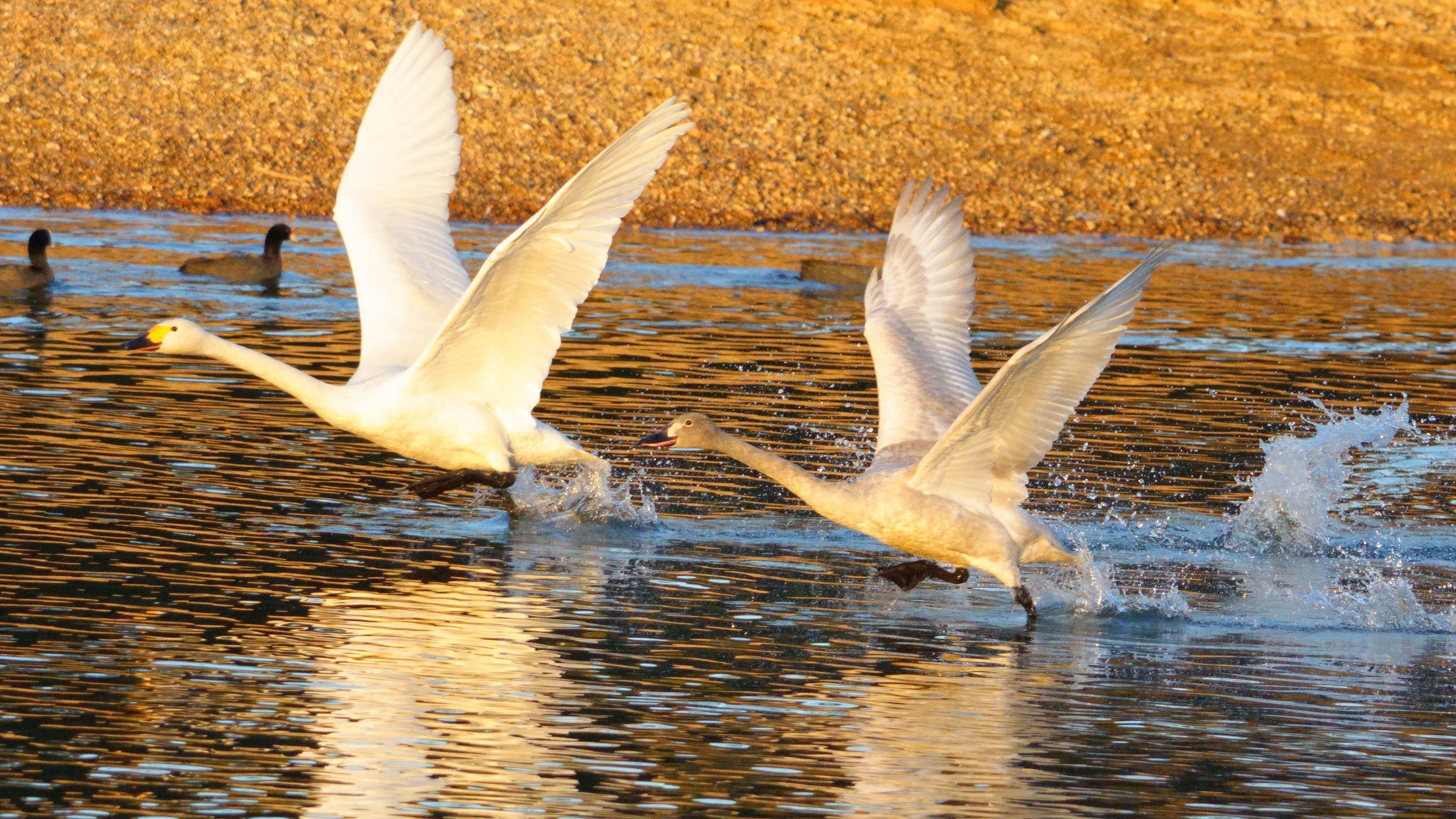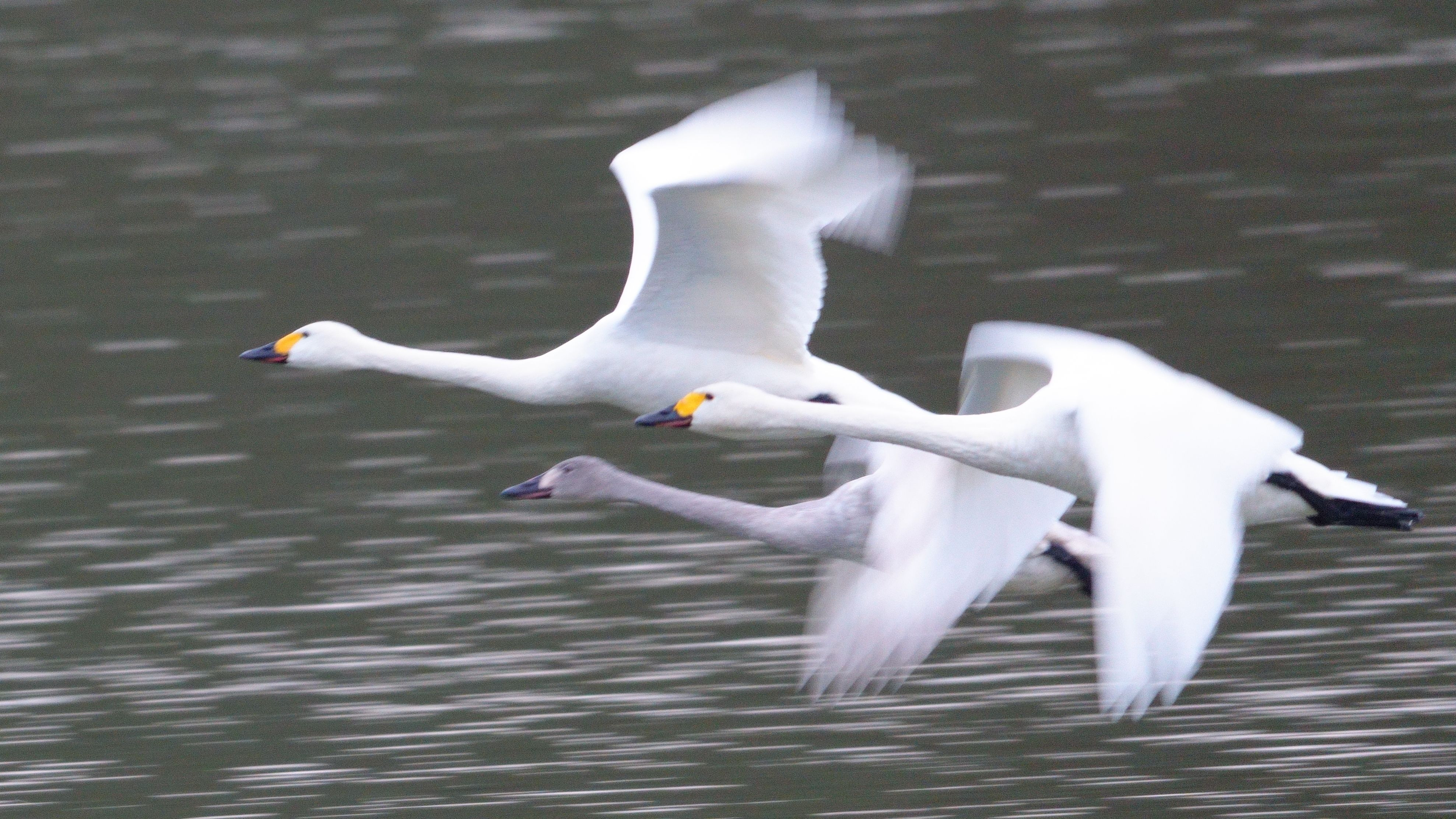 コハクチョウの親子、夕方には飛んでいきます。