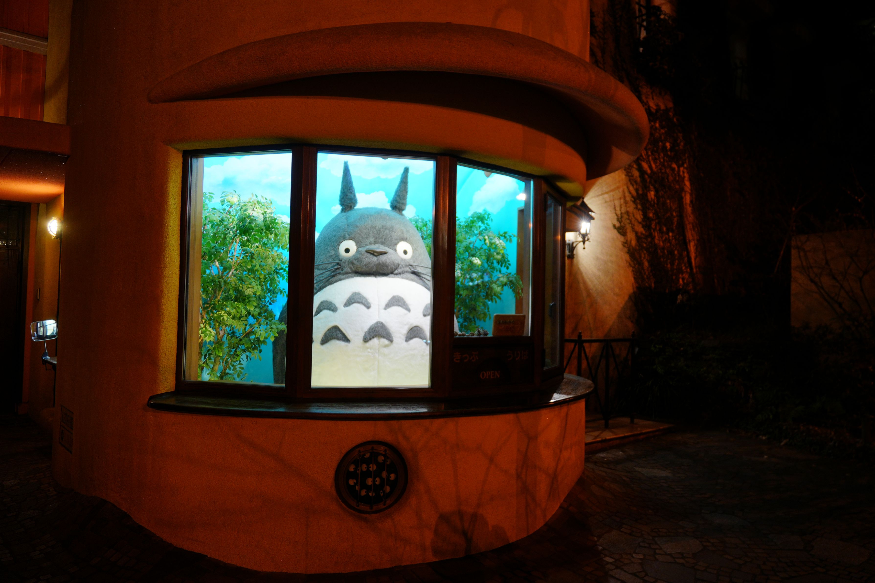 東京都 三鷹の森ジブリ美術館にて 日中は映り込みが厳しい「トトロのニセ受付」ですが、暗くなればこの通り