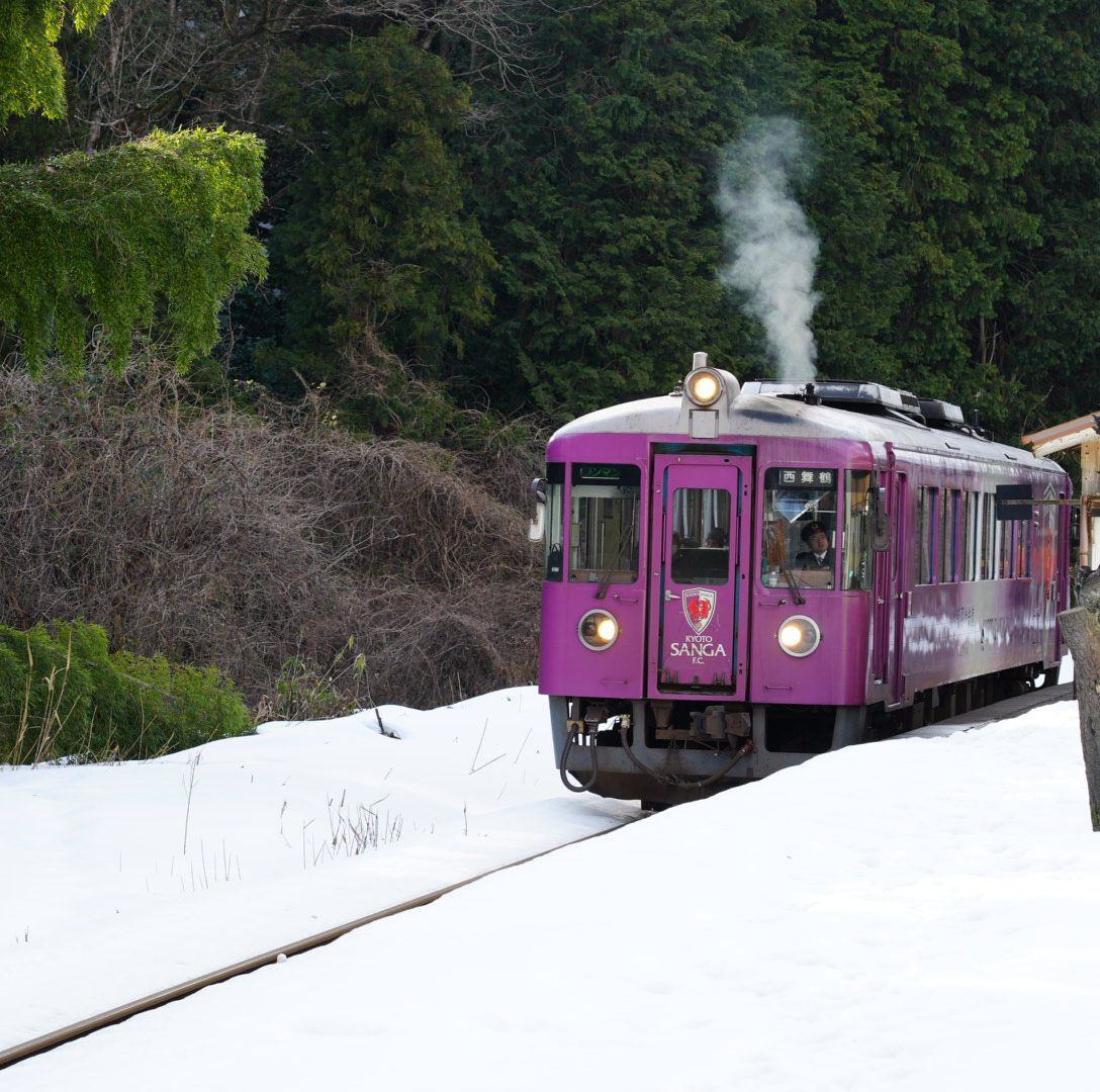 残雪がある古びたホームを煙をあげ出発する サンガトレイン。
