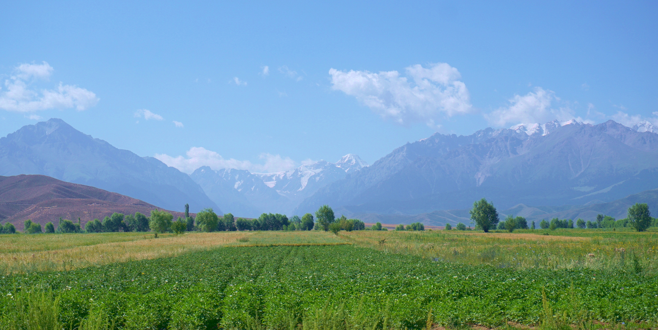 キルギス・スカスカ渓谷に行く途中の休憩地にて。小鳥の さえずり が 聞こえて来そうな 農村風景です。