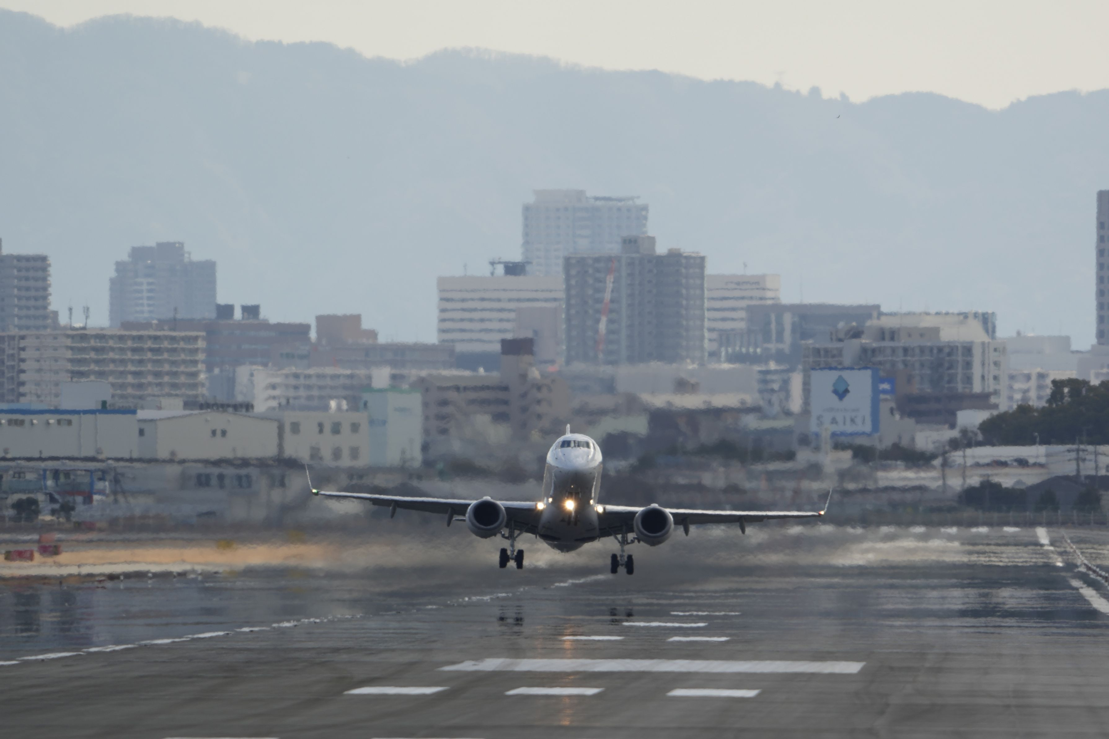 離陸直後に横風にあおられる飛行機