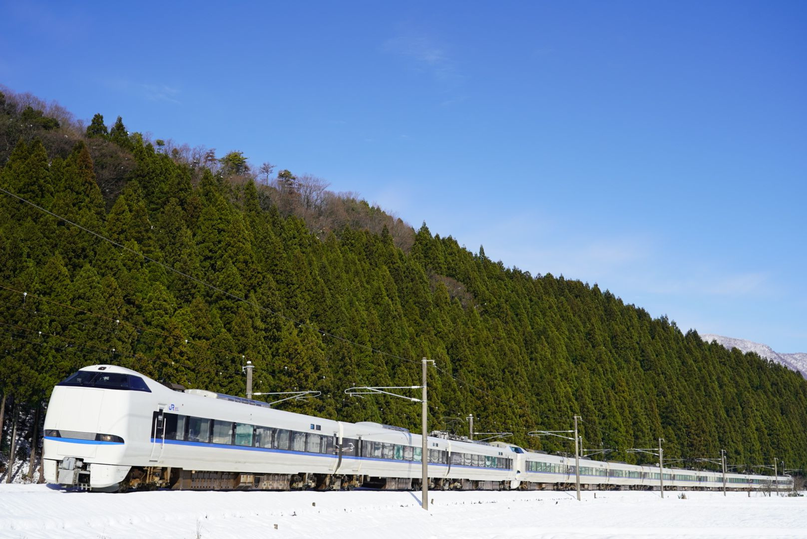 有名なカーブでの撮影真っ白な大地を683系が駆けて行く。