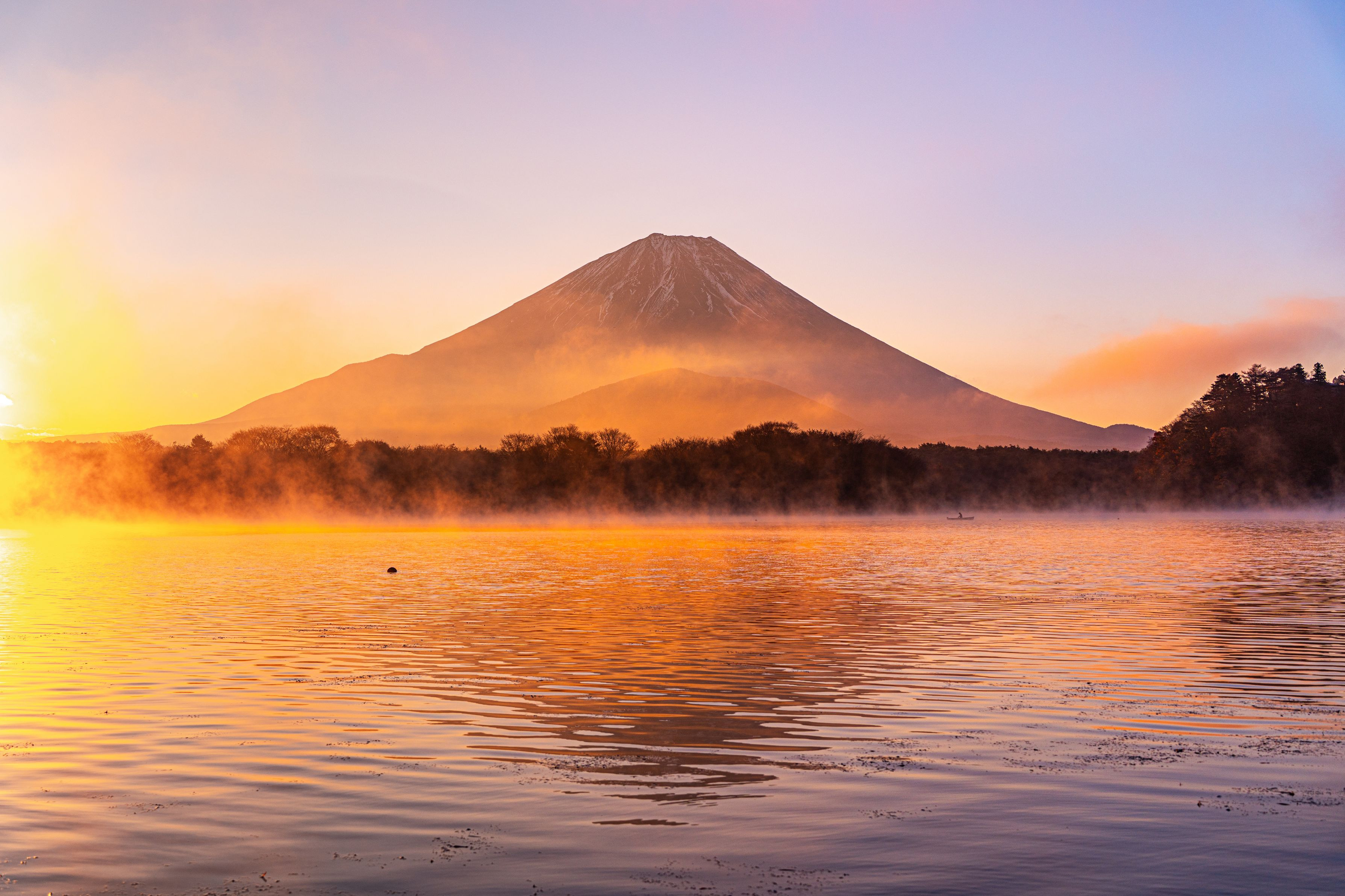 霧が晴れた日の出時刻の精進湖、 まだ赤みの残るオレンジ色の光が湖面や立ち込める気嵐を染め上げます。 時間にして数分間しかない贅沢な景観の中、富士を眺めました。