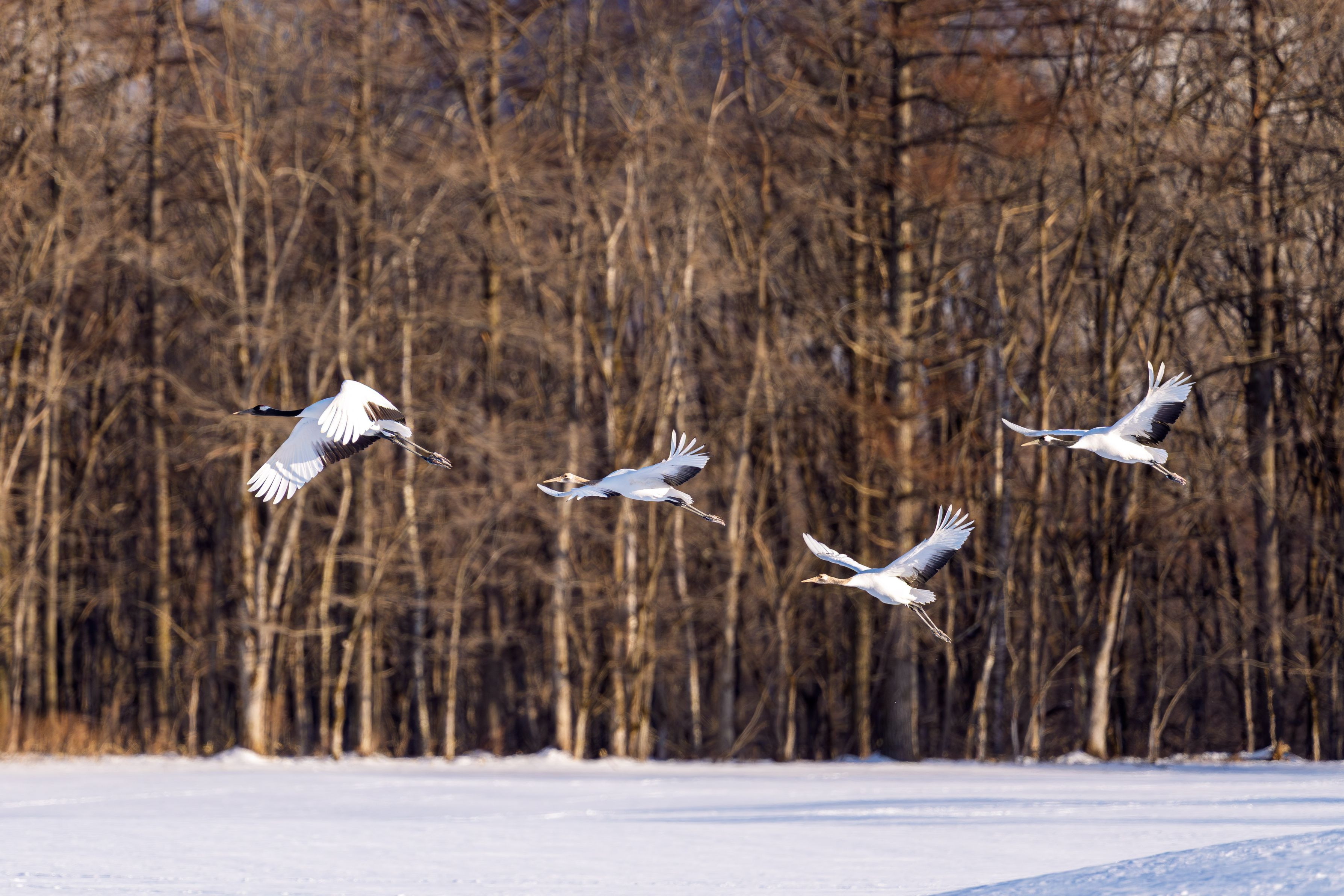 鶴居・伊藤タンチョウサンクチュアリ 午後の給仕が終了しタンチョウの親子が 寝ぐらへと飛び立ちました