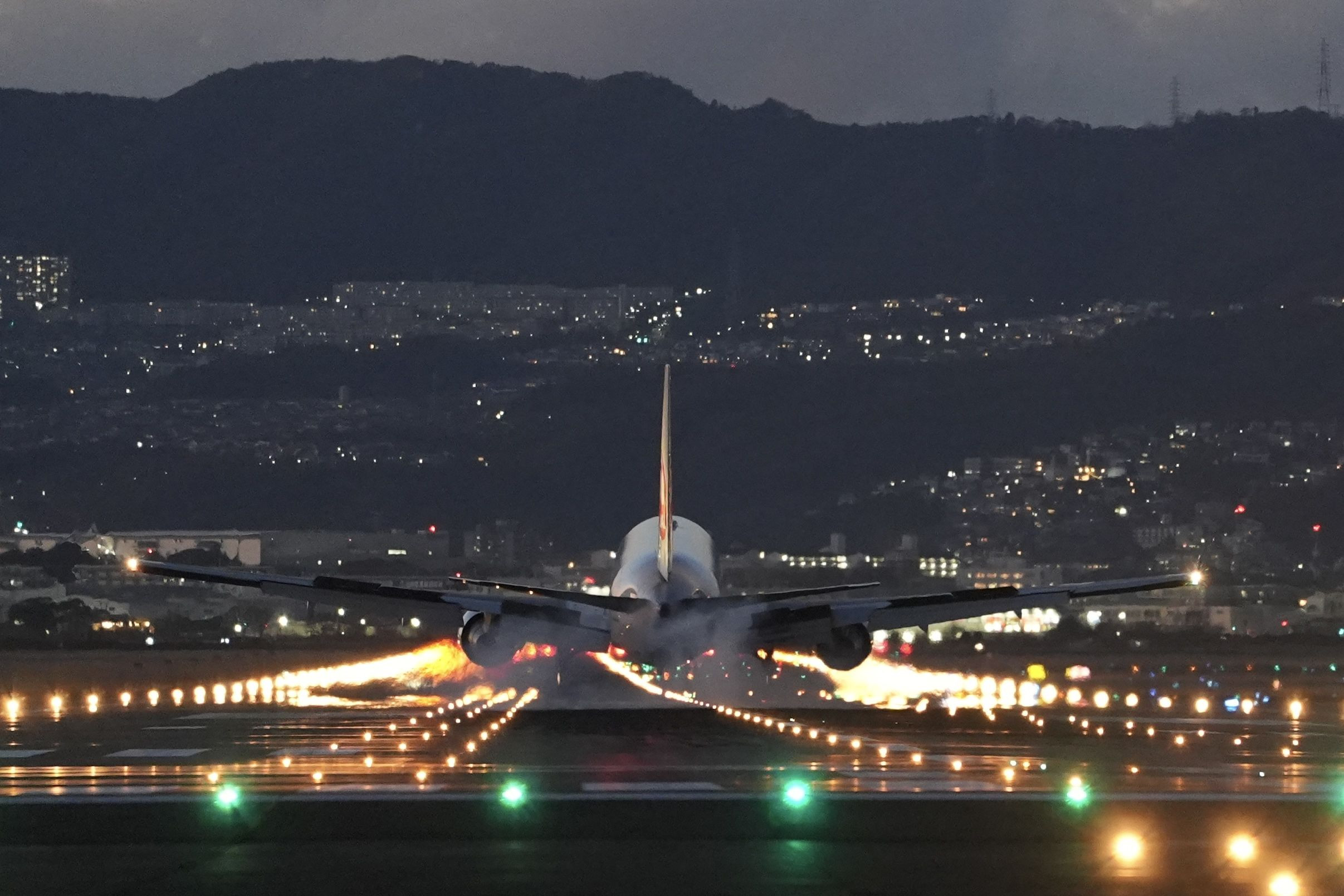 夜間着陸する飛行機