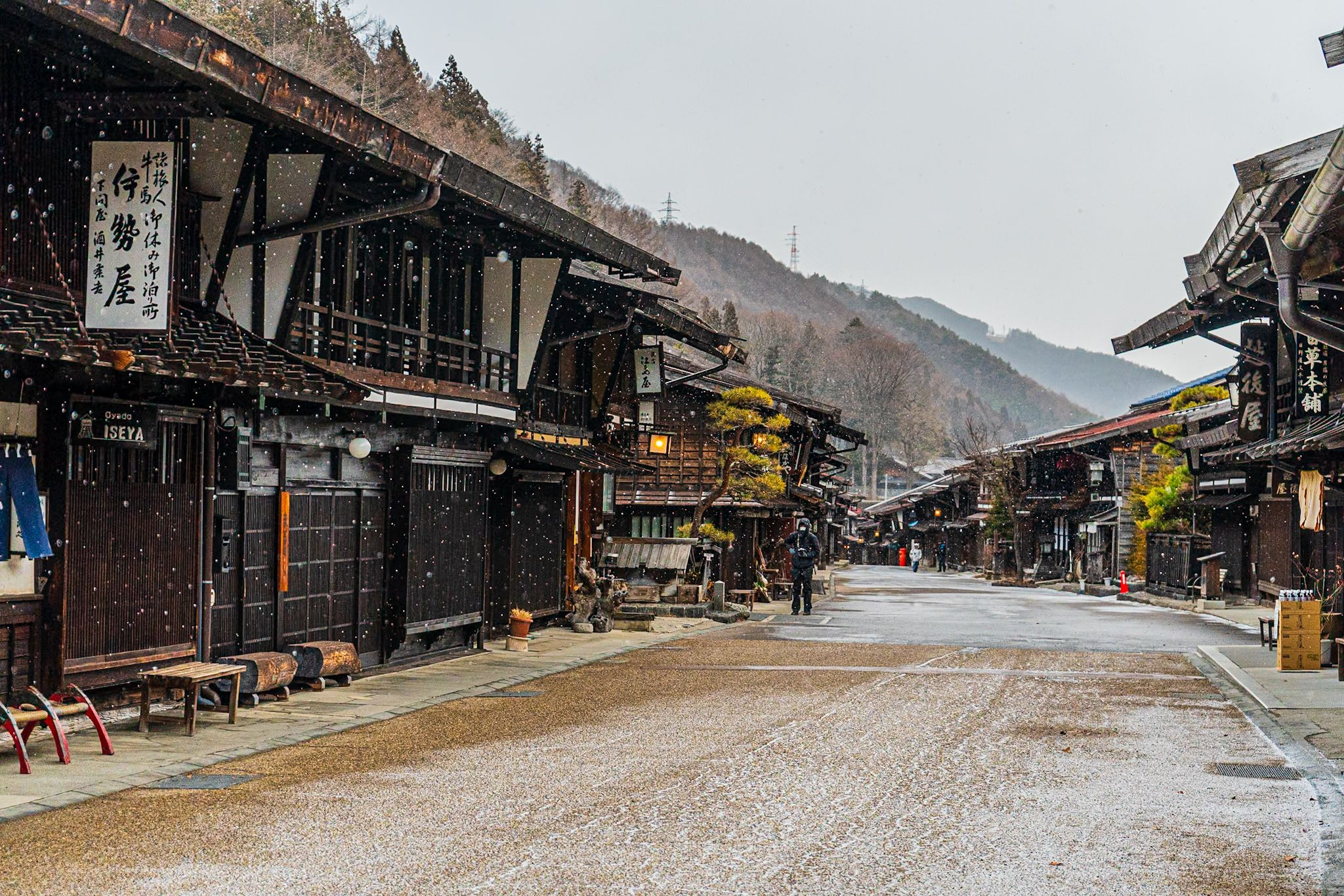 中山道の奈良井宿です。 小雪の舞う寒い日でした。