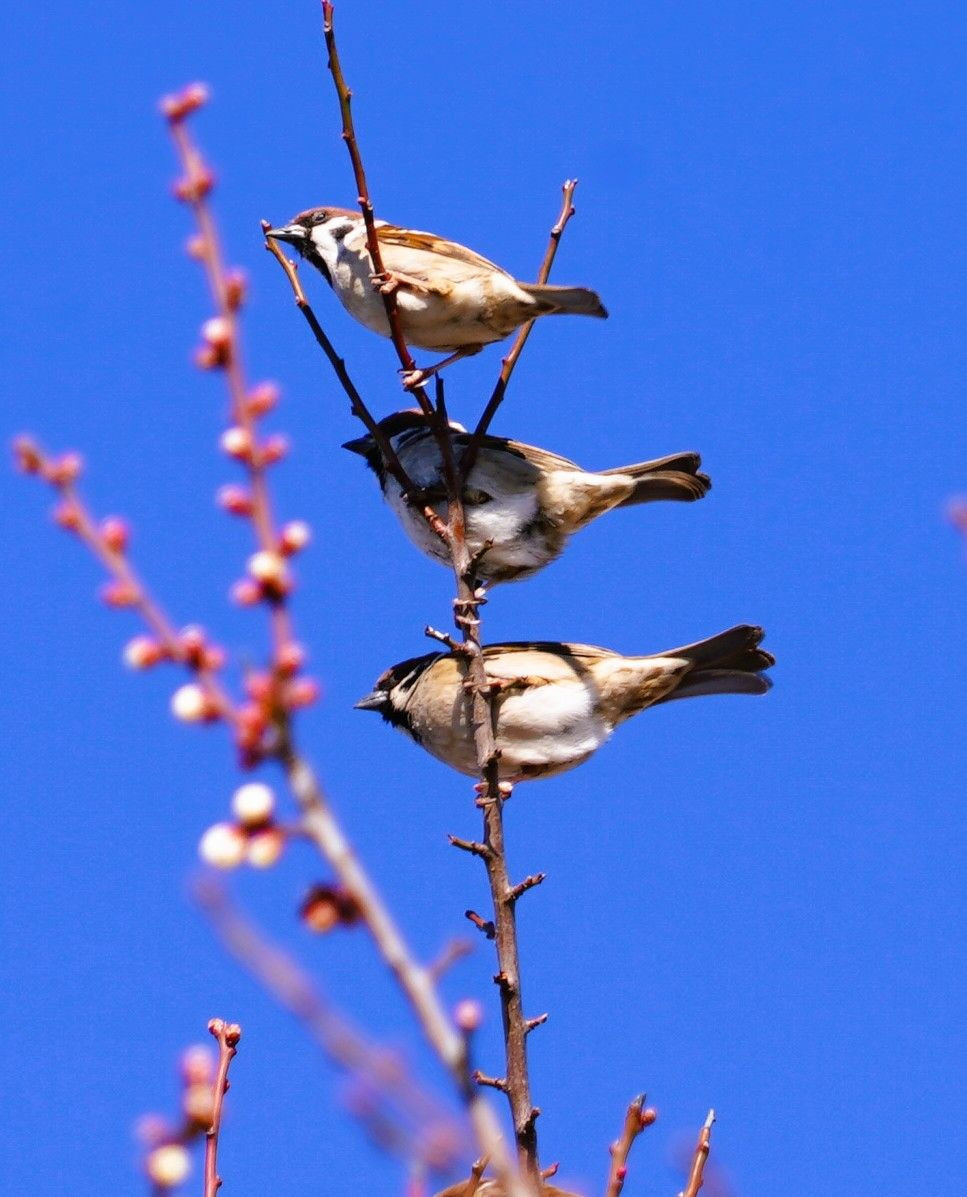 開花が始まった白梅に飛来して並んでとまったスズメ