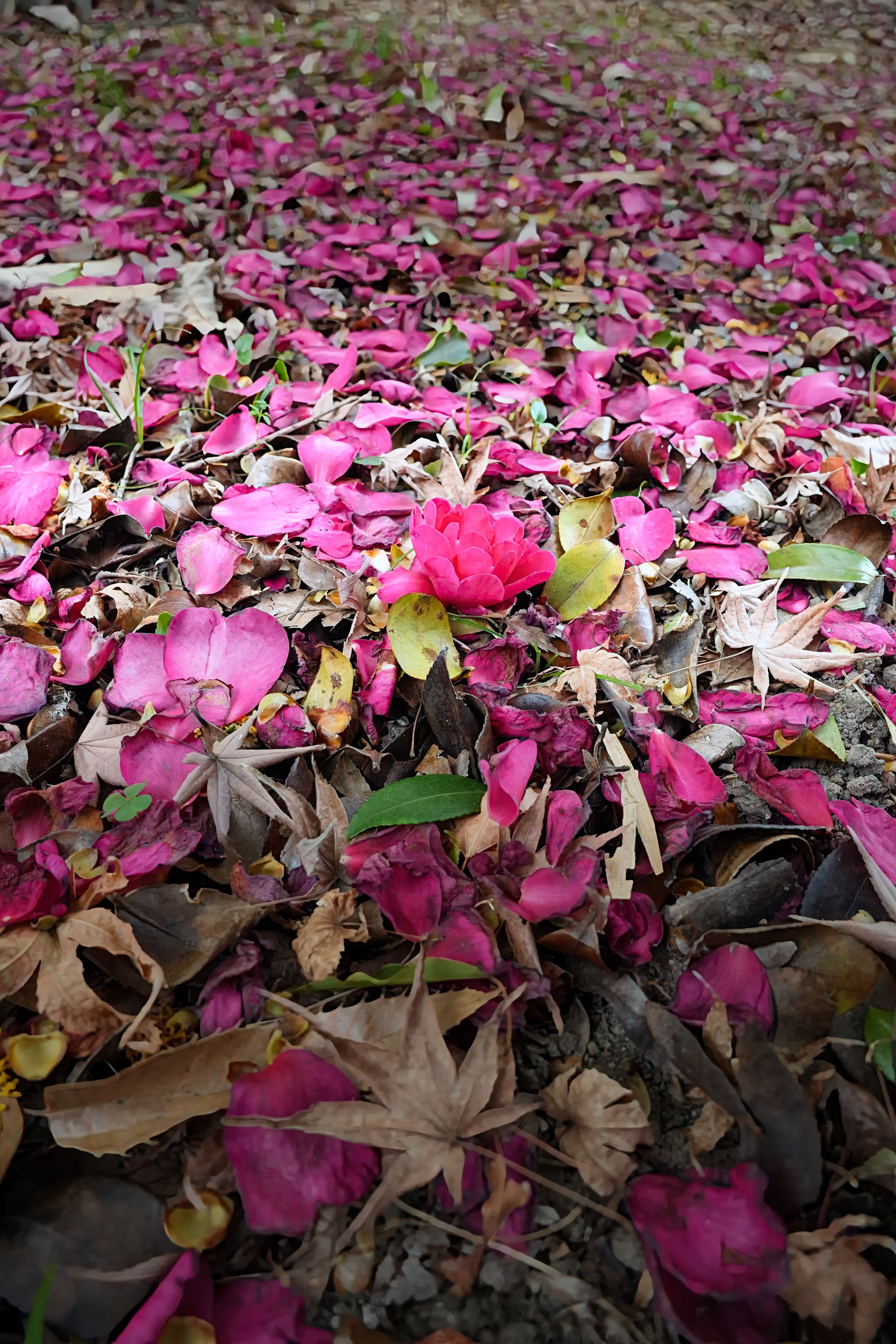強い風で椿の花びらが地面に広がっていました。