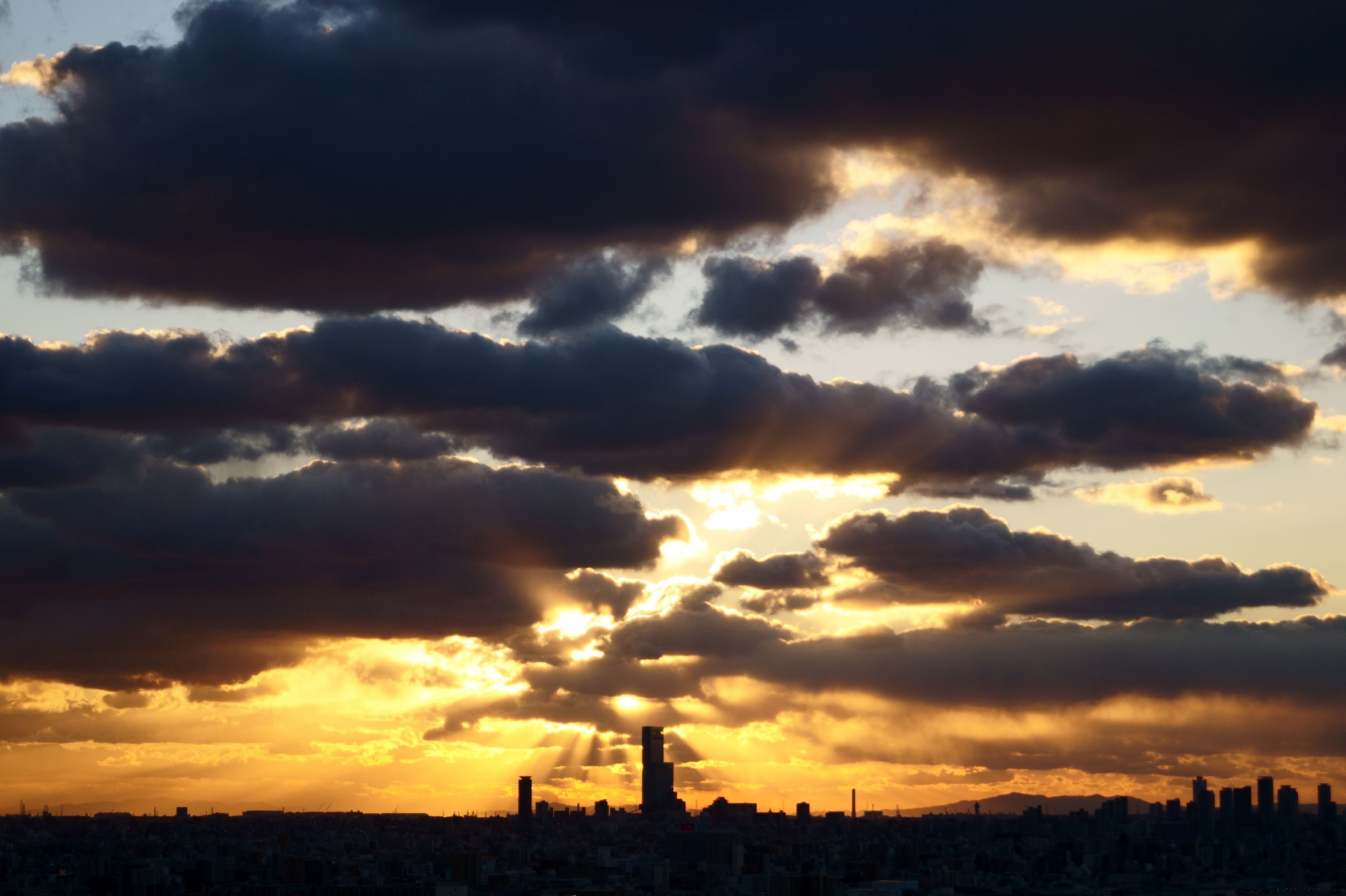 大阪湾に夕陽が沈み、あべのハルカスがシルエットになっていました。