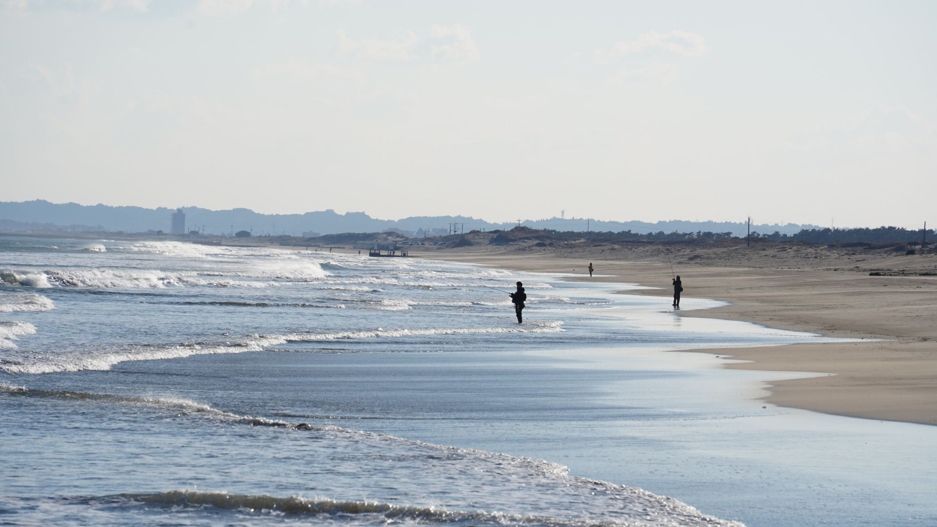 北風が強く寒い中、釣りを楽しむ人たち