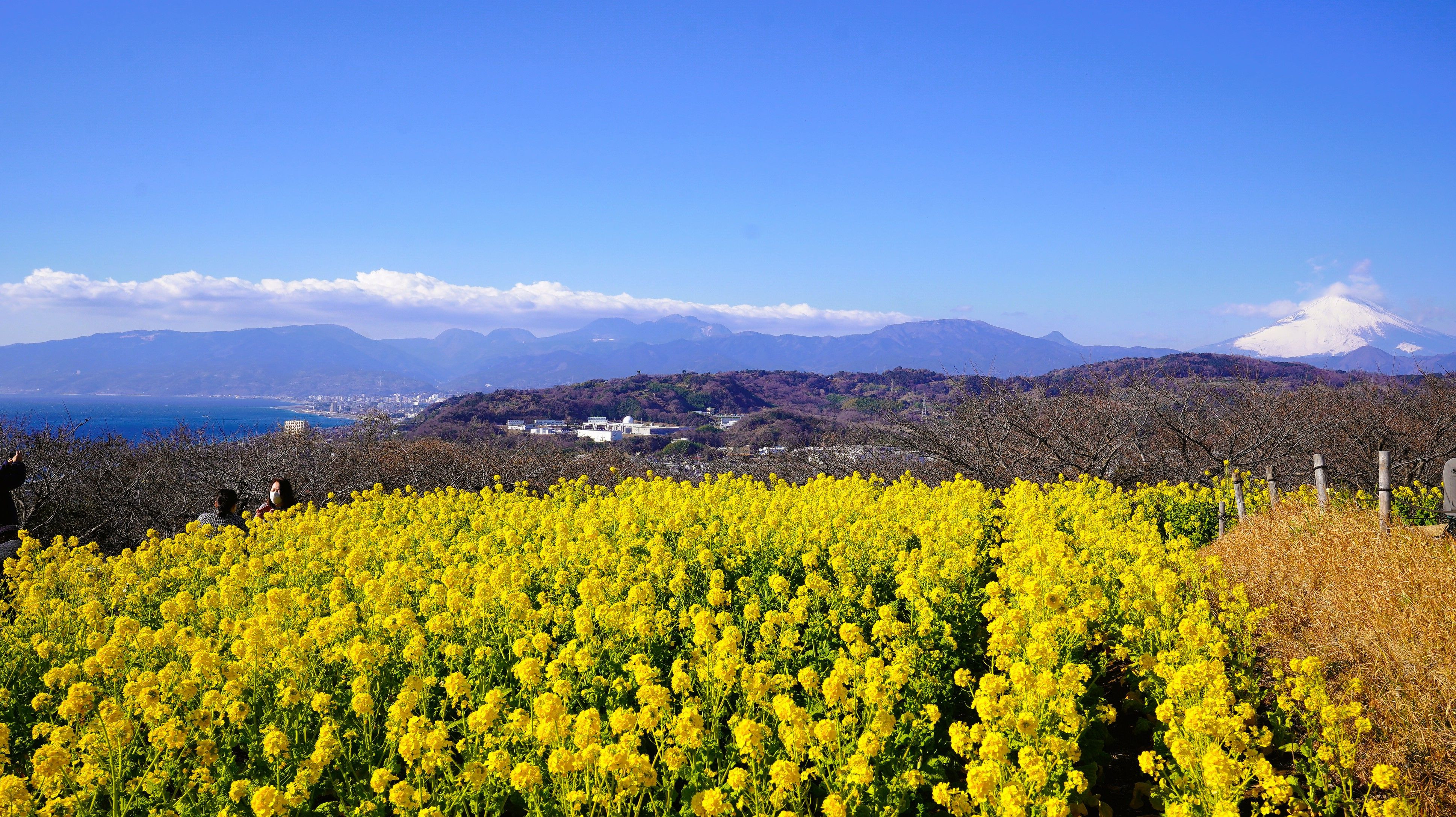 早春、菜の花と駿河湾、真白な富士山
