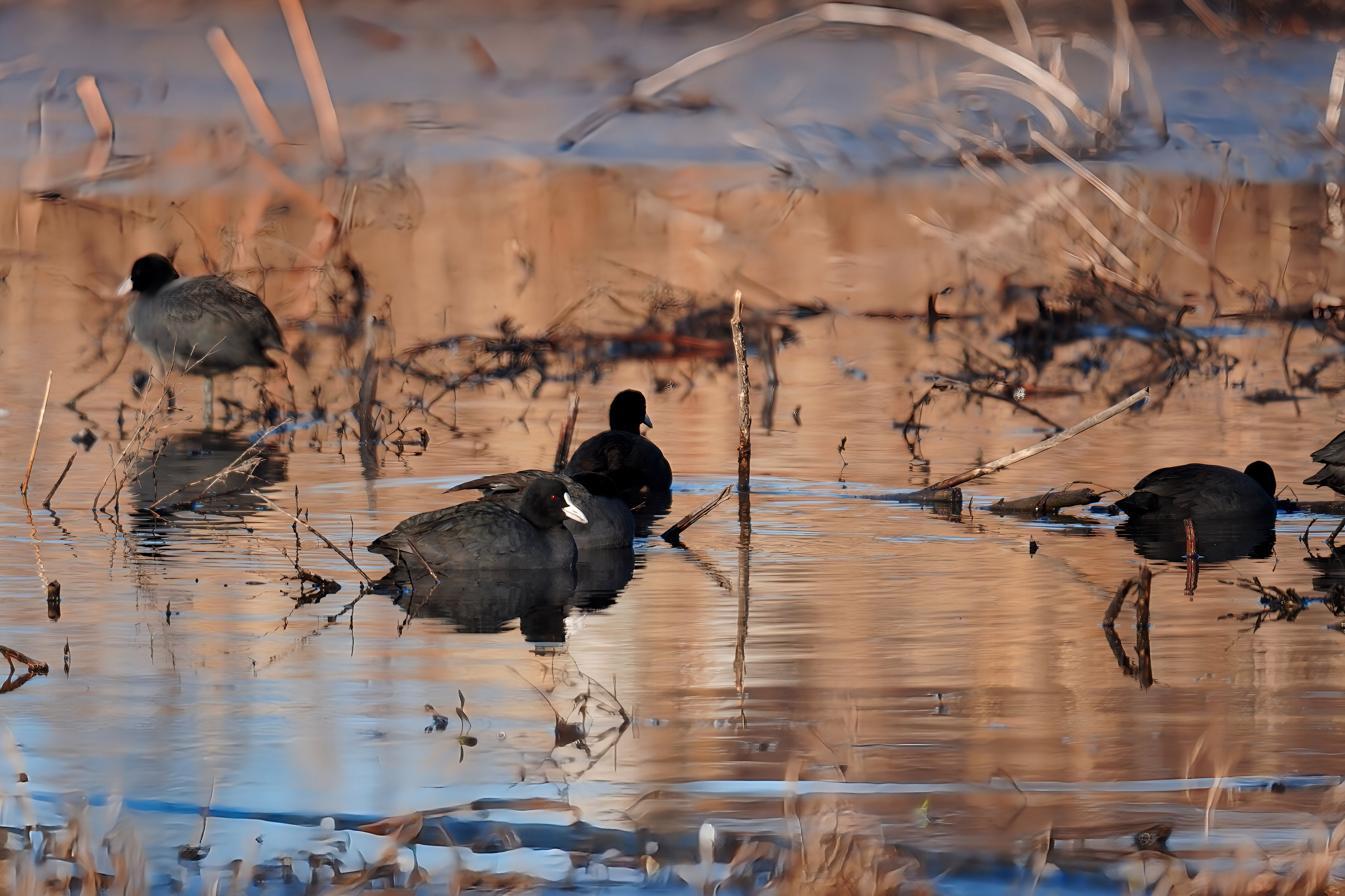 1月24日 長いことアップしていないご無沙汰していたオオバンさん。 数羽で寛いでいるようでした。 朝一番の出合いでした。(トリミングあり)