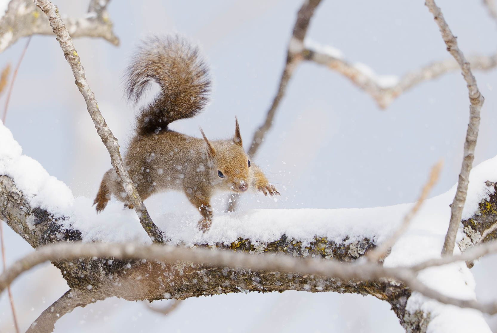 雪があってもものともせず超スピードで駆けていく野生のニホンリスです