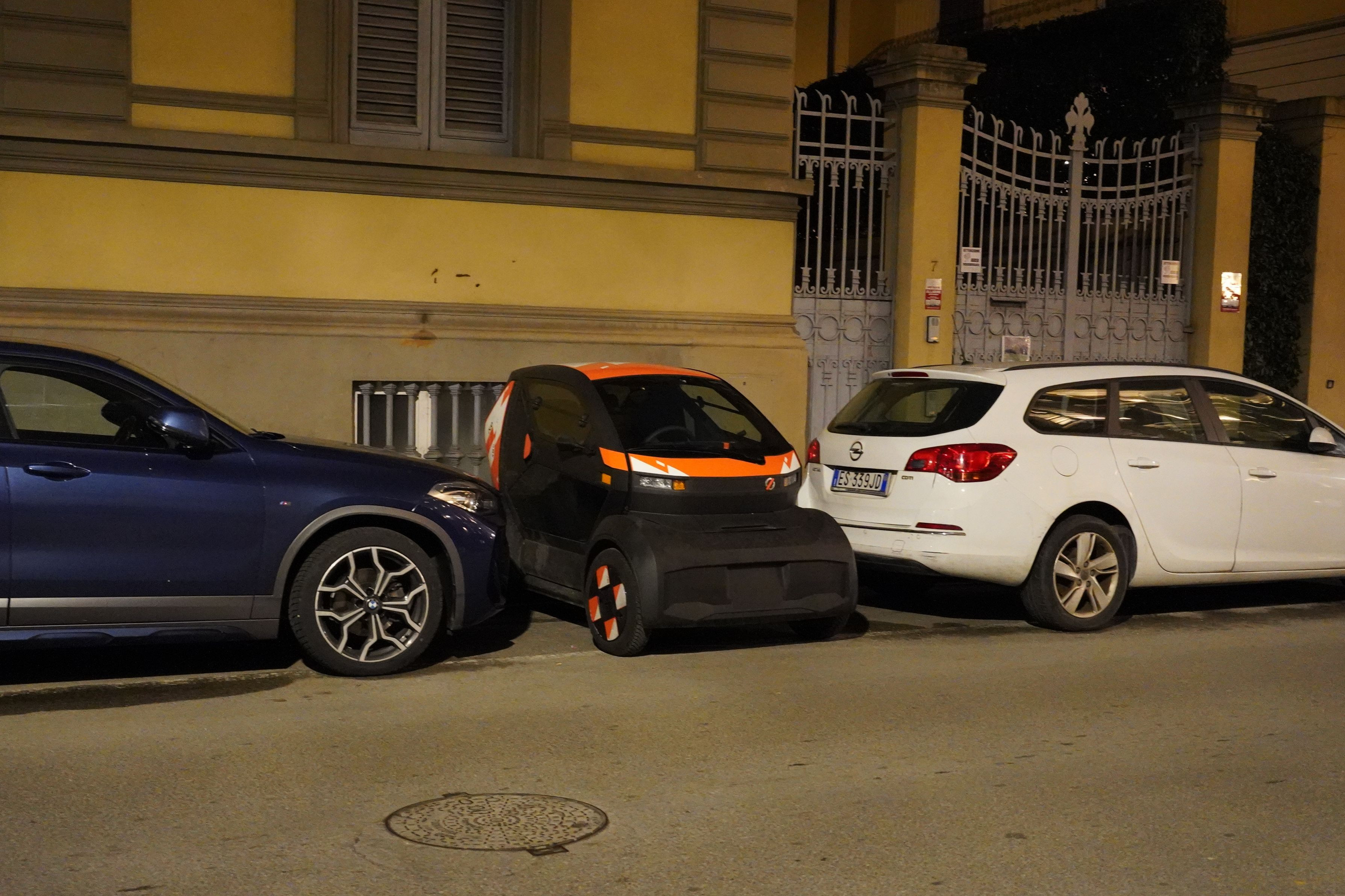 フィレンツェのホテル近くで見かけました。 道路わきにびっしりと車が停めてある中で、思いもかけない駐車方法。 考えましたね。超小型車ならでは。 しかし、青い車はどうやって出すのか謎です。