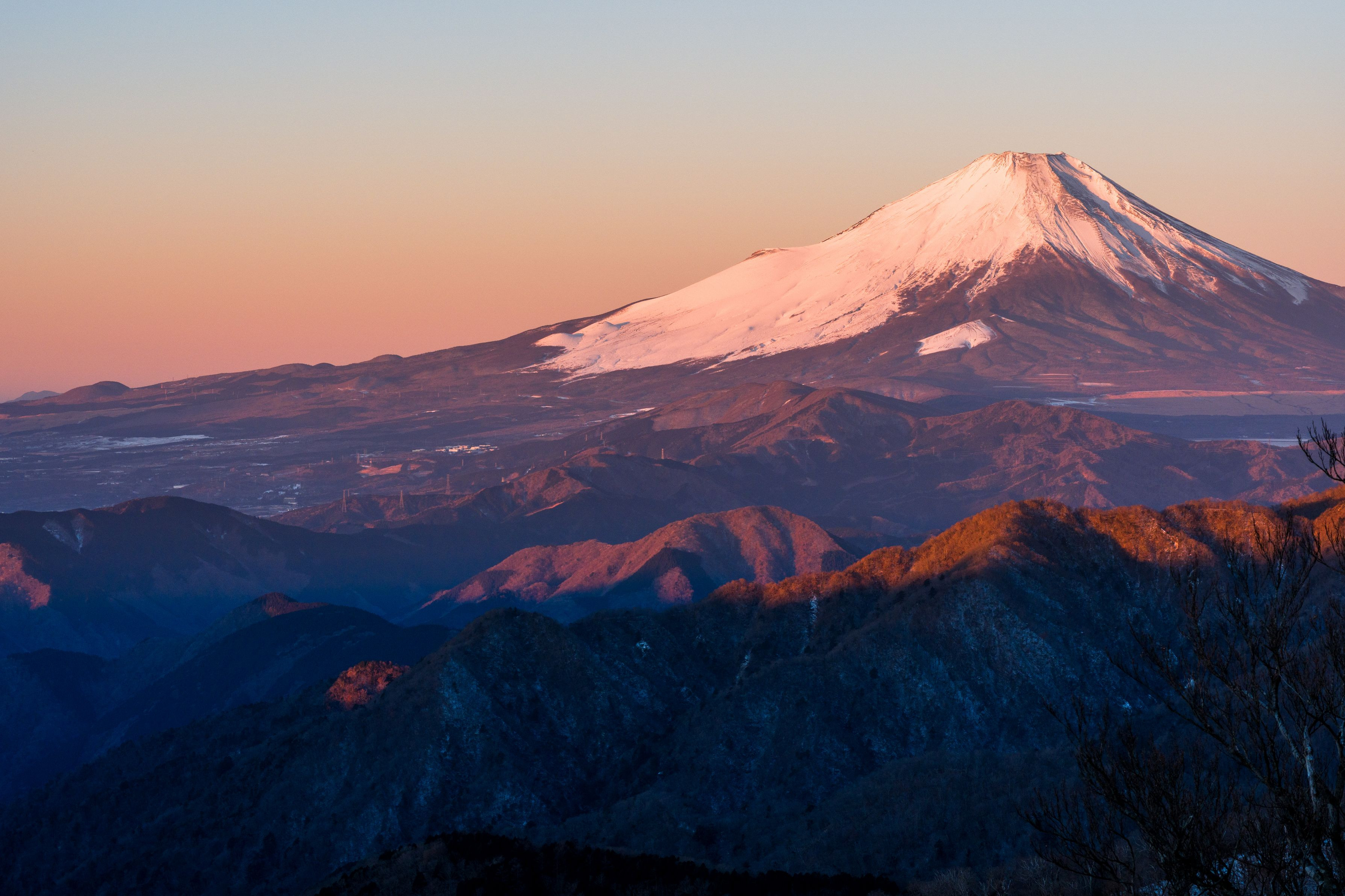 丹沢登山2日目 日の出直後の紅色の富士山を撮影