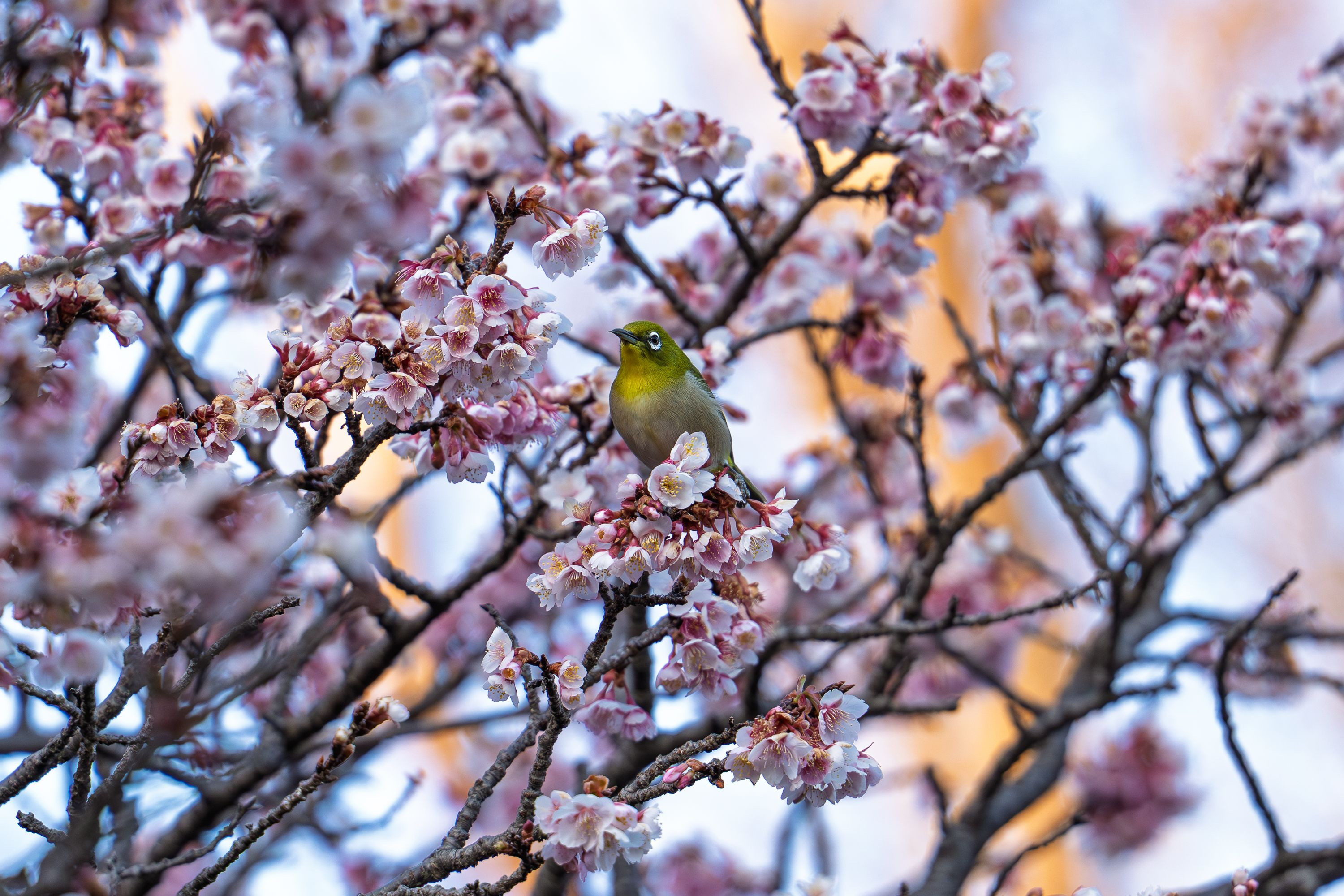 まだ気温一桁の肌寒い夕方の公園。 小さなメジロが桜の花の蜜を吸う仕草が可愛らしくシャッターを切りました。 浜松市緑化推進センターみどり~な α1 + TAMRON 70-180mm F2.8 G2