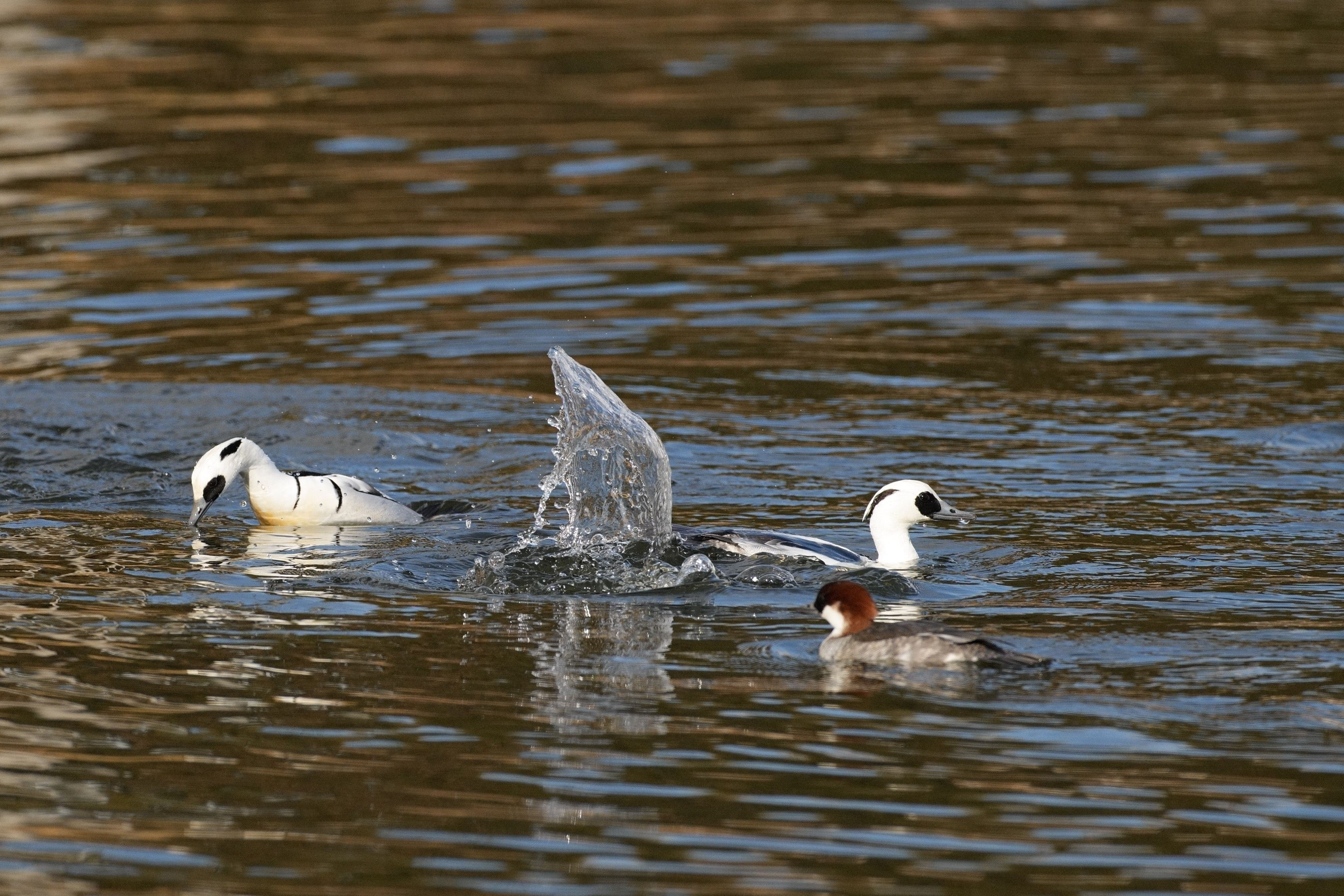 雲の切れ目から少し明かりが差し込んだ時、潜りっこして交互に水草を食べているところですが、一羽潜水して水柱が立ちました。これがとても珍しく、まるでミコアイサが氷山を作ったアートのように思われ何度も見返しながらいろいろ思いを巡らしています。