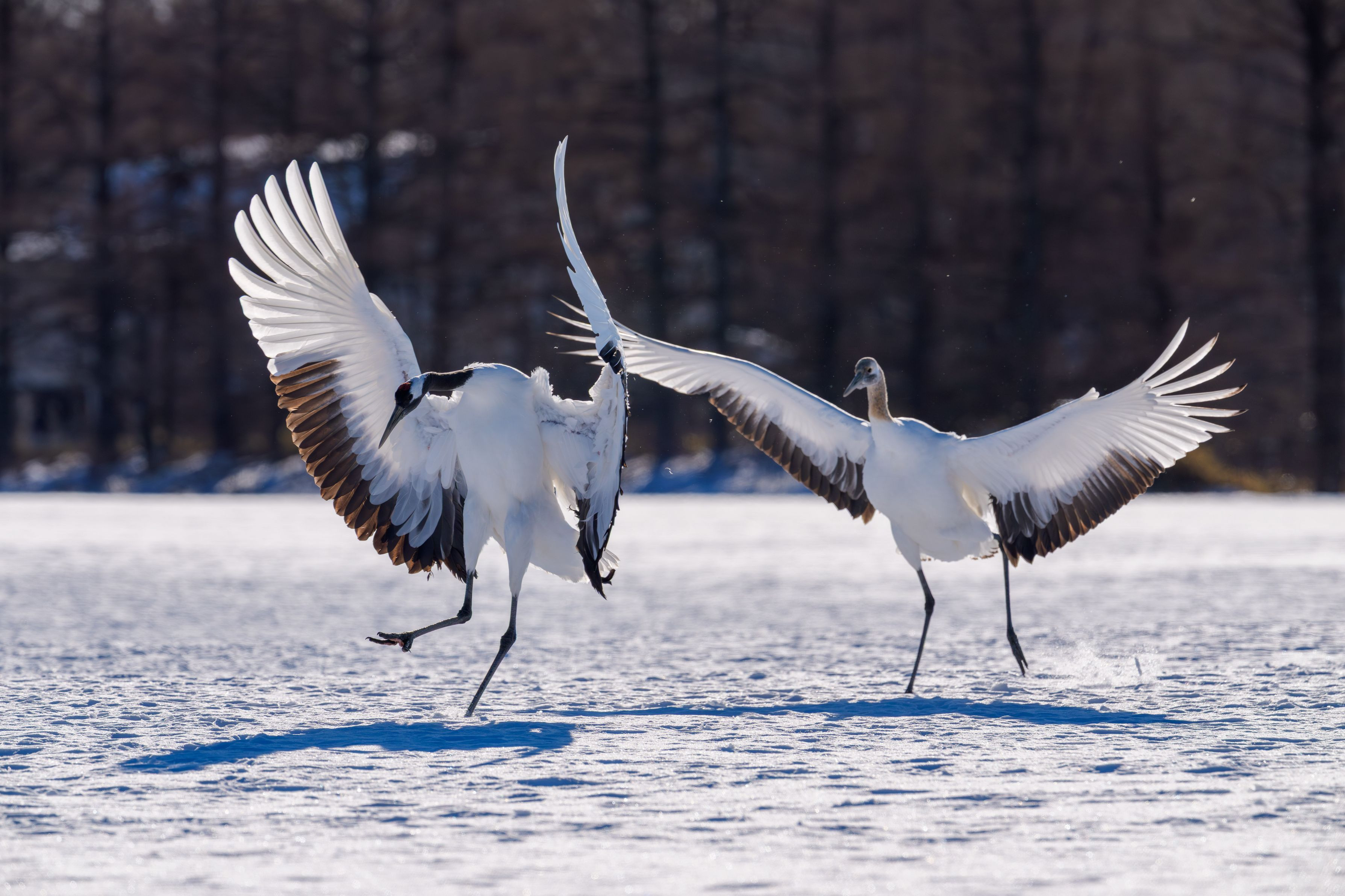 鶴居・伊藤タンチョウサンクチュアリ 朝の給餌に合わせてタンチョウの親子が飛来