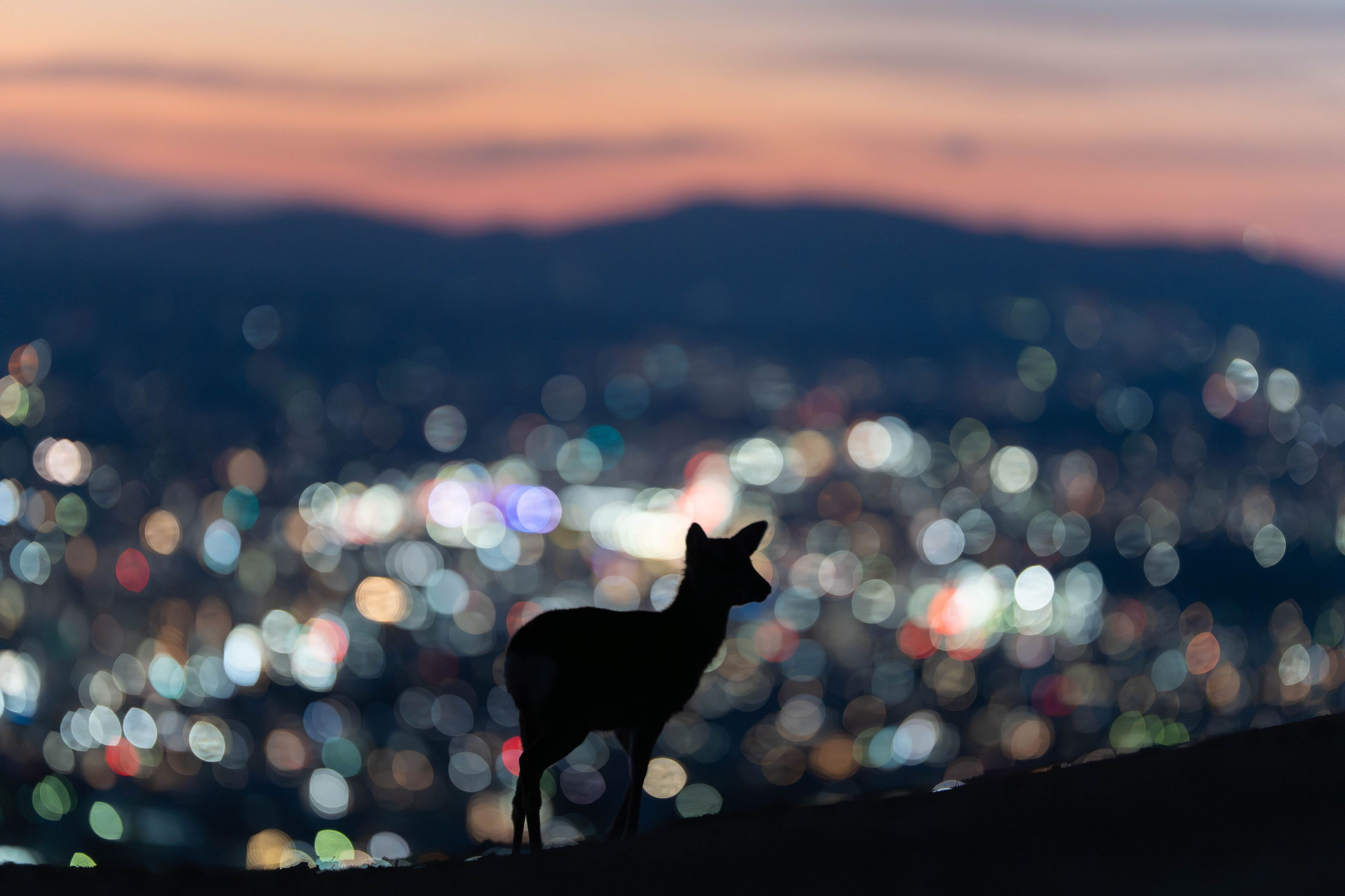 夕暮れが終わり、街に明かりが灯り始める頃。 高台から静かに下界を見下ろすシルエットに目が留まりました。 都会の喧騒をよそに、そこだけが止まっているかのような静寂な時間。 美しいボケ味とともに、一瞬の出会いを切り取ってみました。
