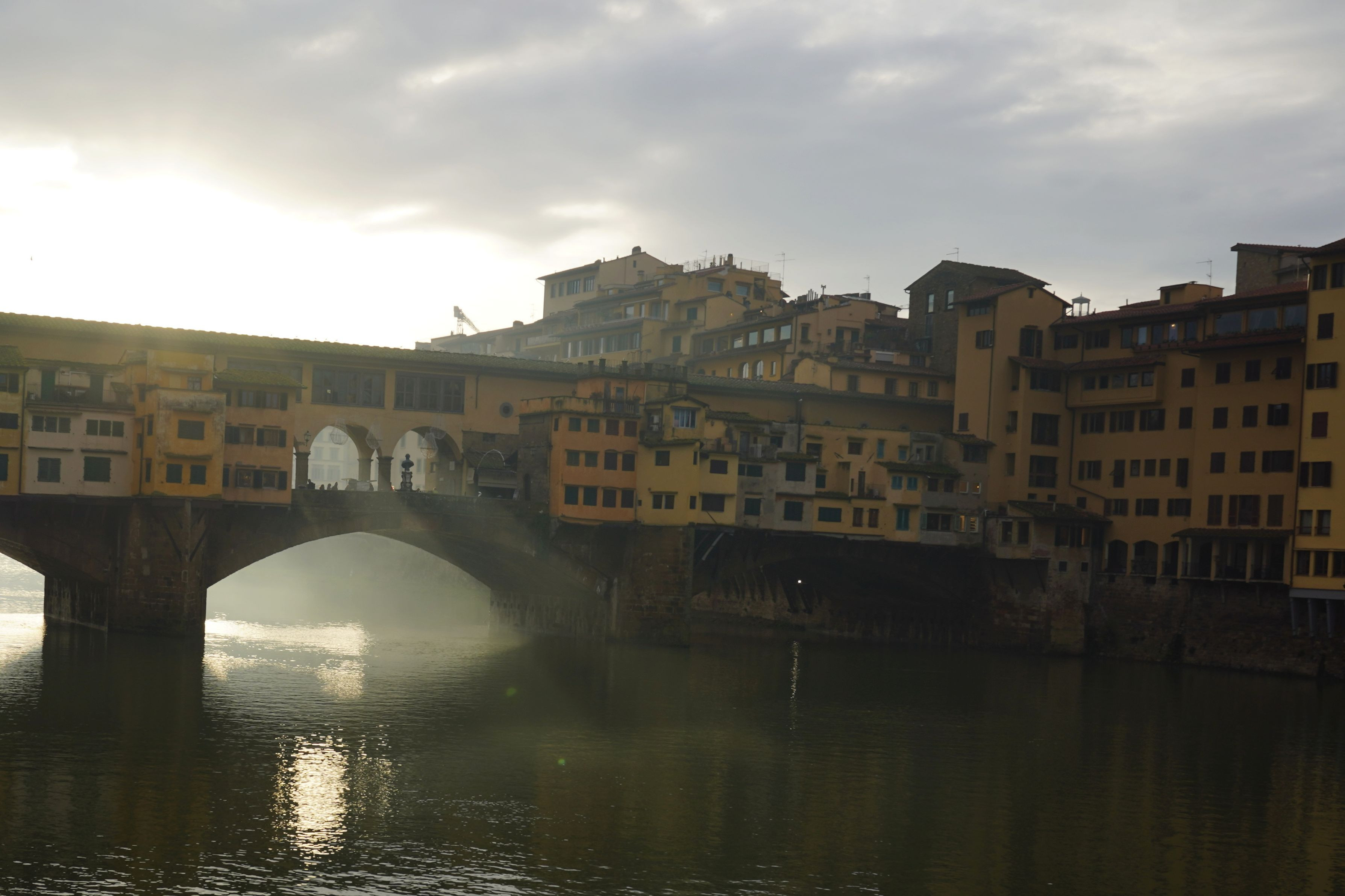 フィレンツェのヴェッキオ橋です。 訪れたとき、ちょうど朝の光が橋を通り抜けて良い感じだったので撮りました。 現在の橋は1345年に再建されたものだとか。