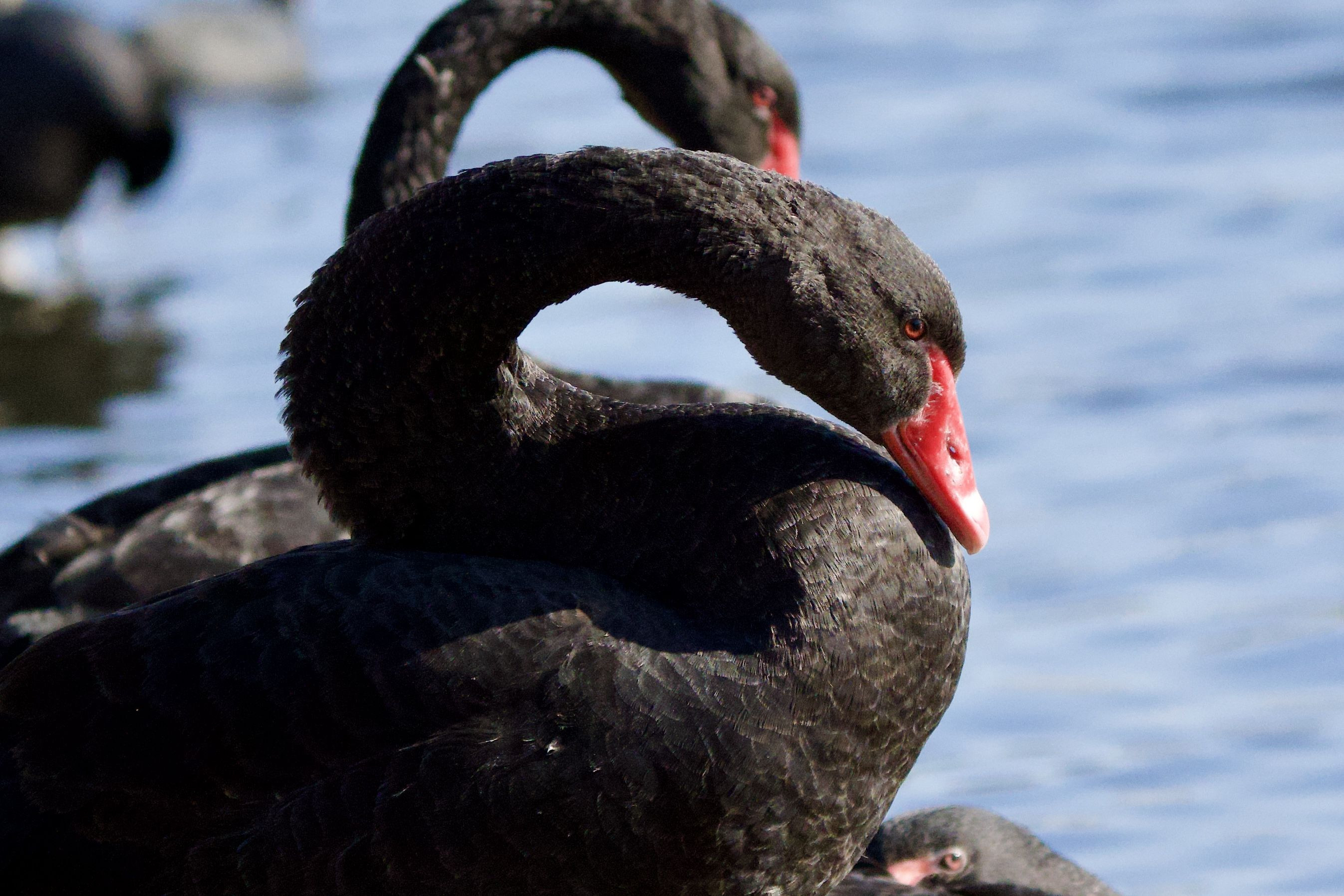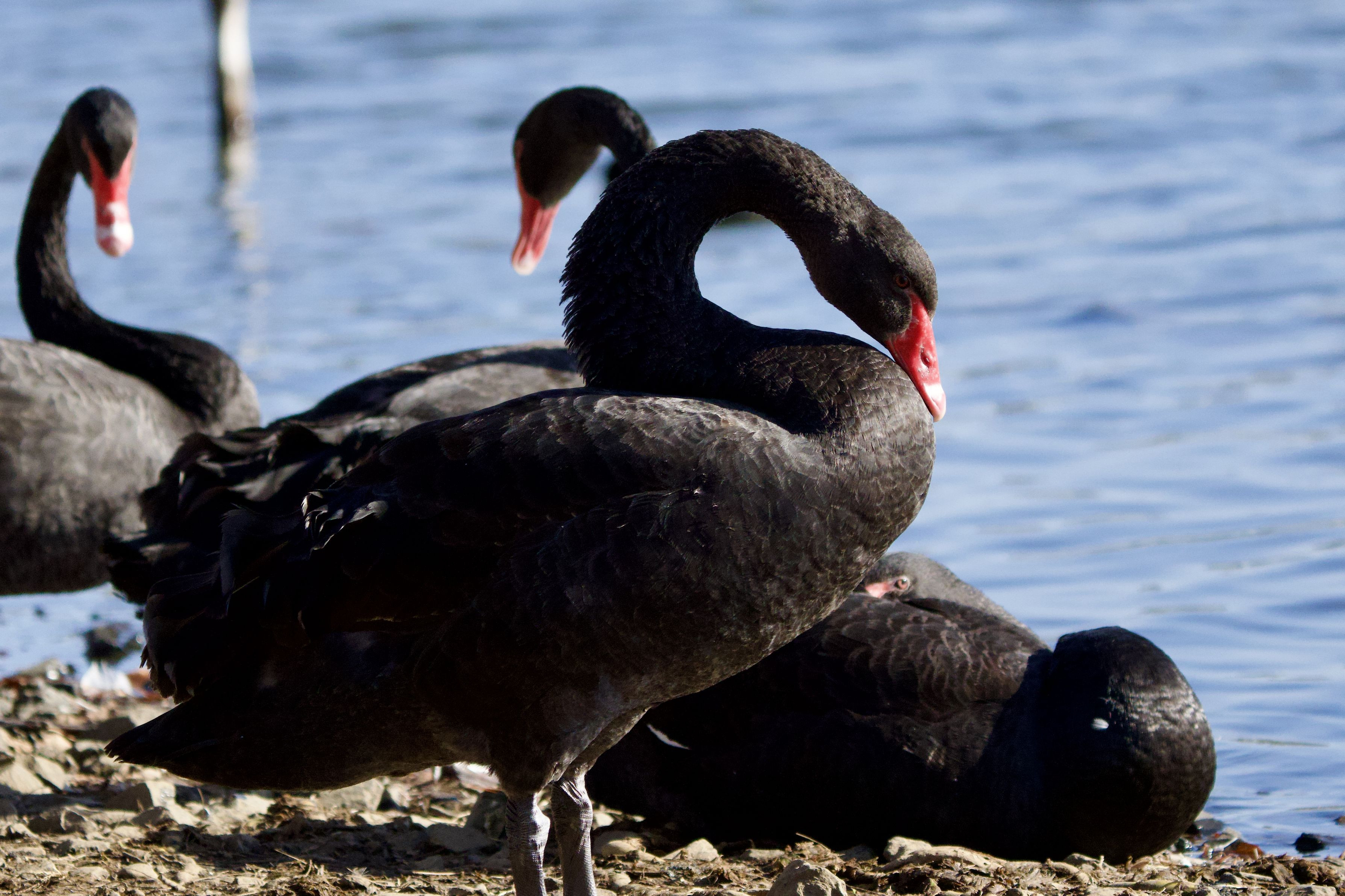 オオハクチョウがたくさんいる池に5人家族のコクチョウがいました。