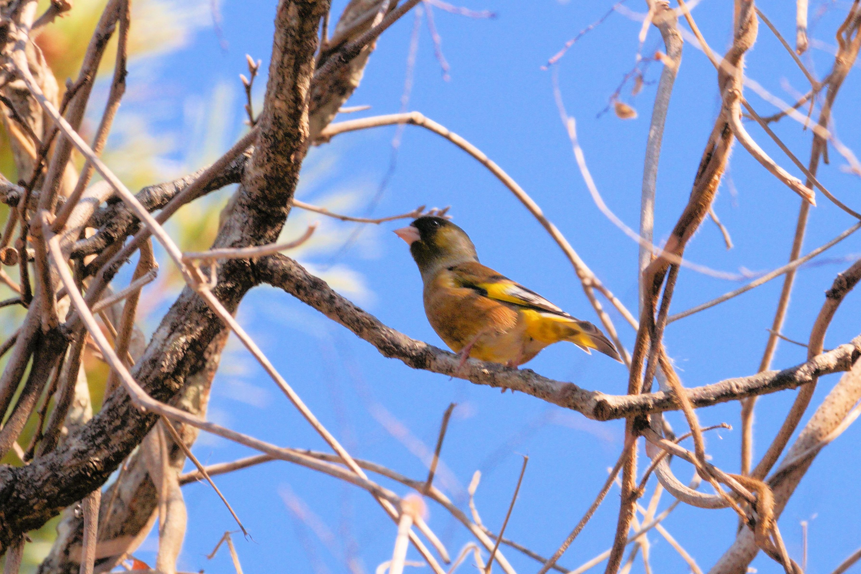 カワラヒワは12月は群れを見かけたのですが、1月になってつがいで生活しているようです。後ろ下から見ると黄色が目立ちます。