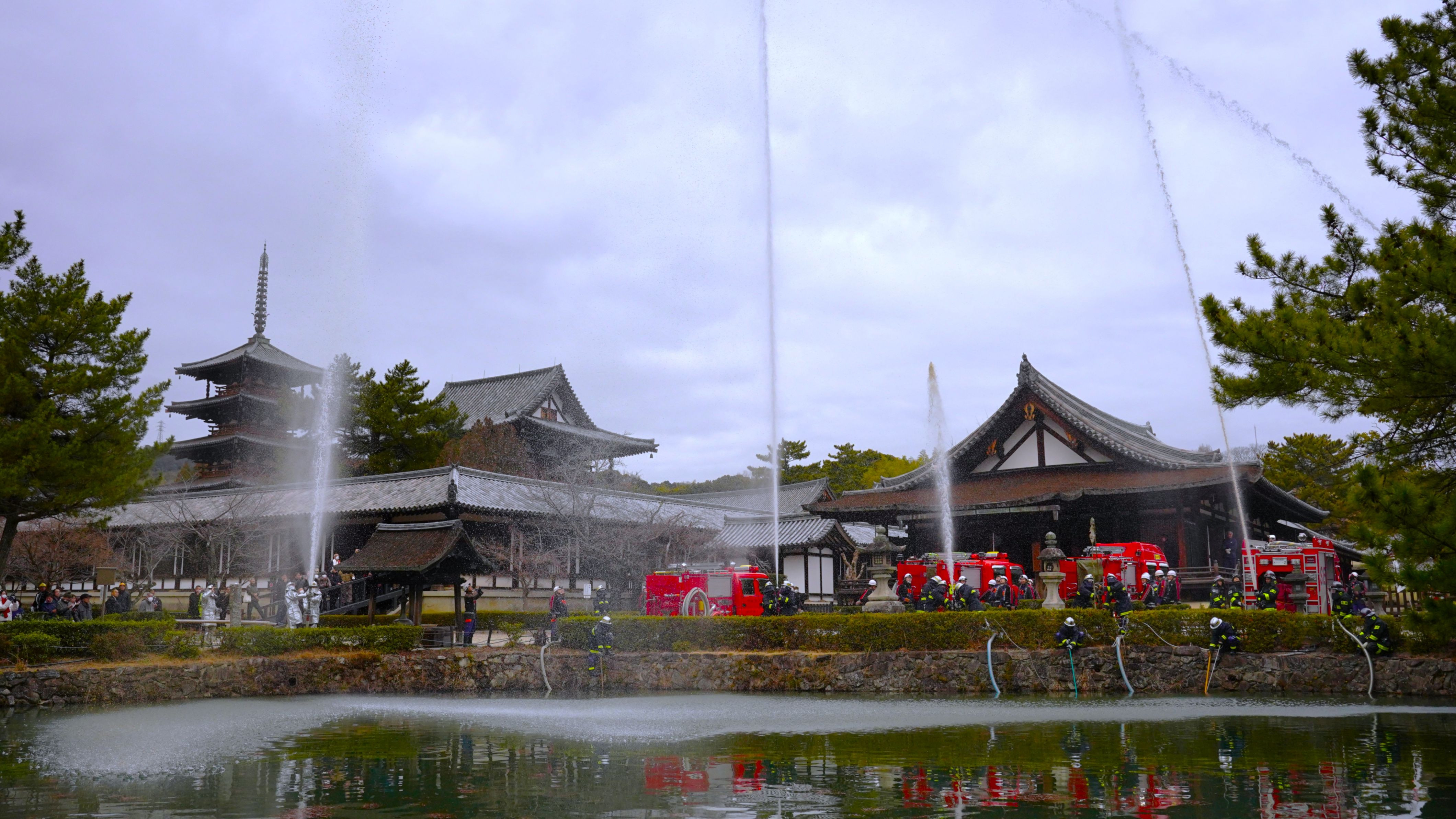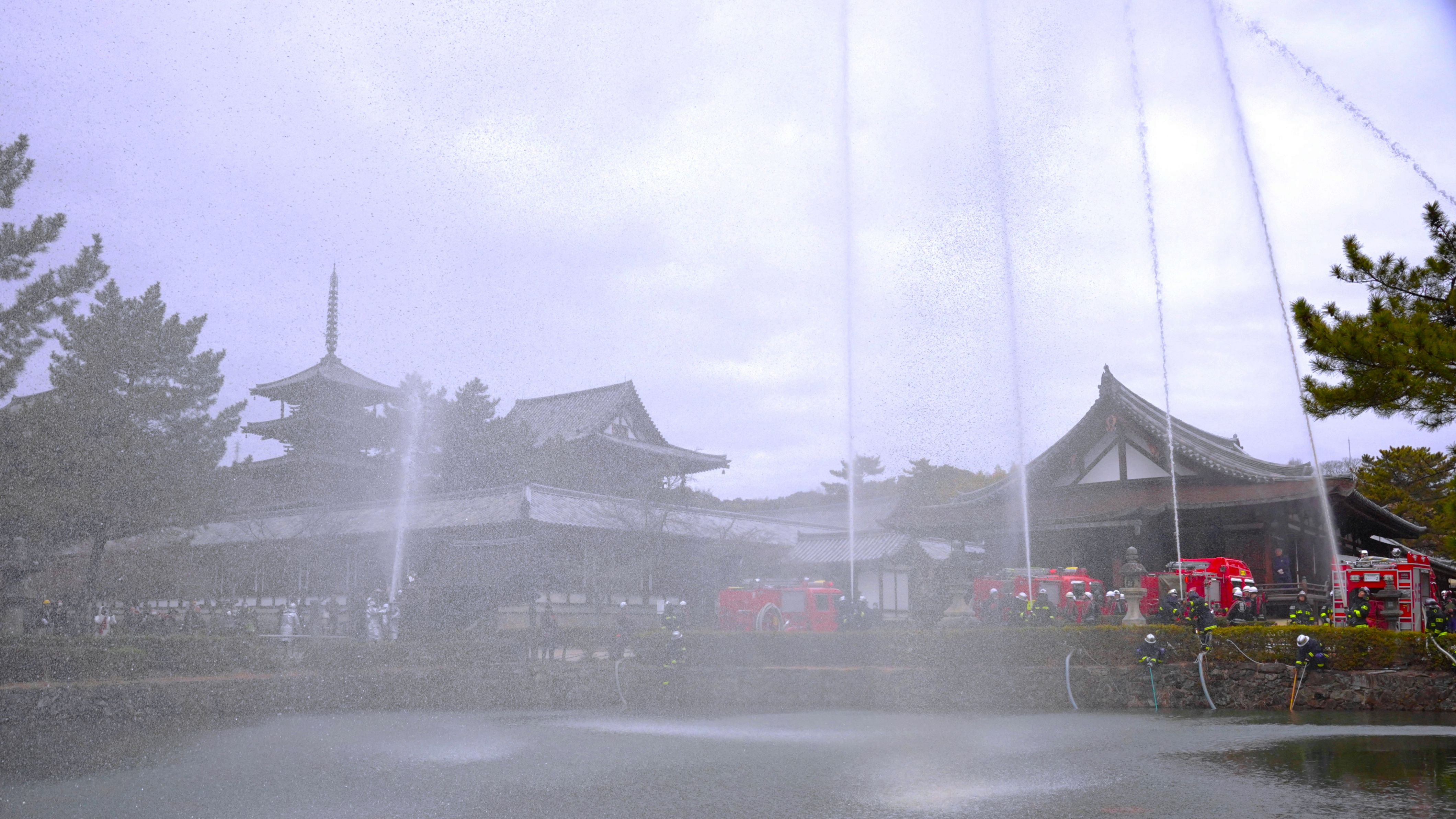 毎年1月26日(文化財防火デー)に世界遺産・法隆寺では放水訓練が行われます