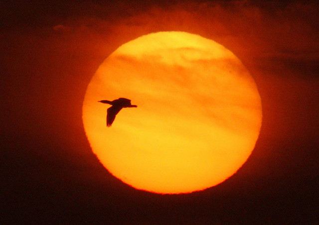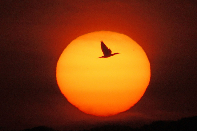 朝陽には、飛び交う鵜がシルエットに。
