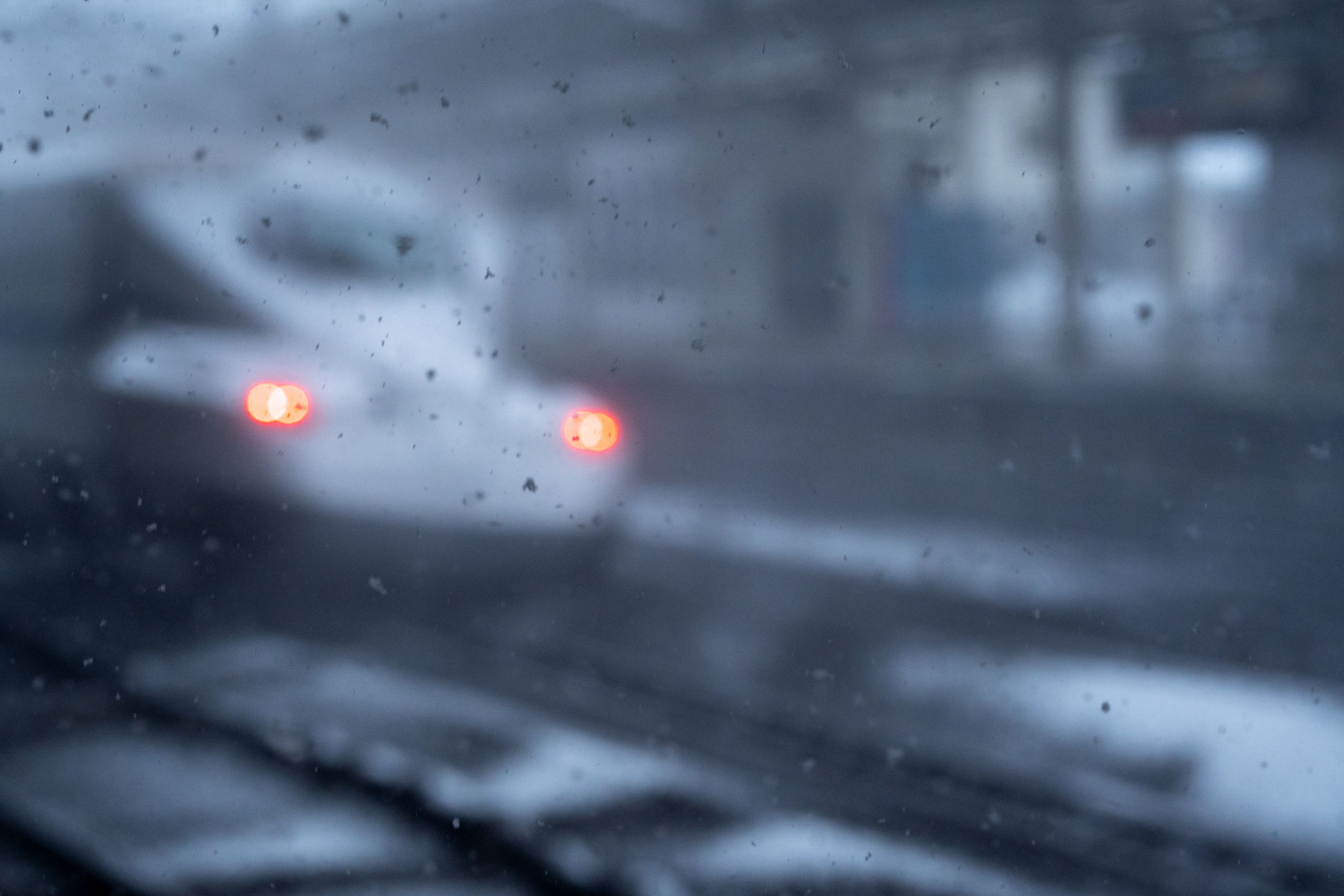 走り去る新幹線 雪が舞うホーム