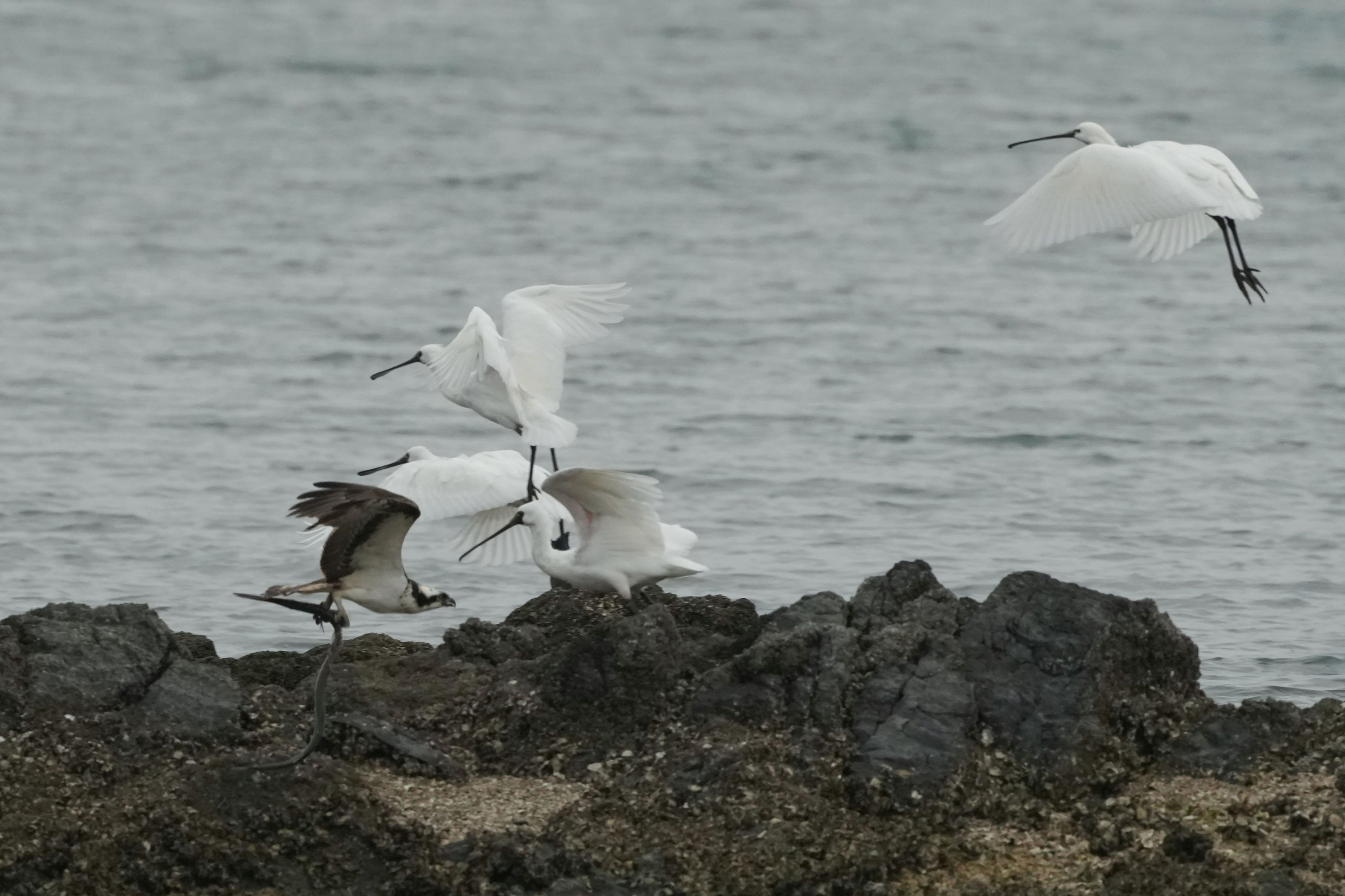 久しぶりにクロツラ一家が磯でゆっくりしているところに、ミサゴが餌をぶら下げて闖入した。驚き飛び立つクロツラ一家。その一瞬をとらえました。 このミサゴは「骨肉の争い」と同一の個体、一枚目の一秒前。