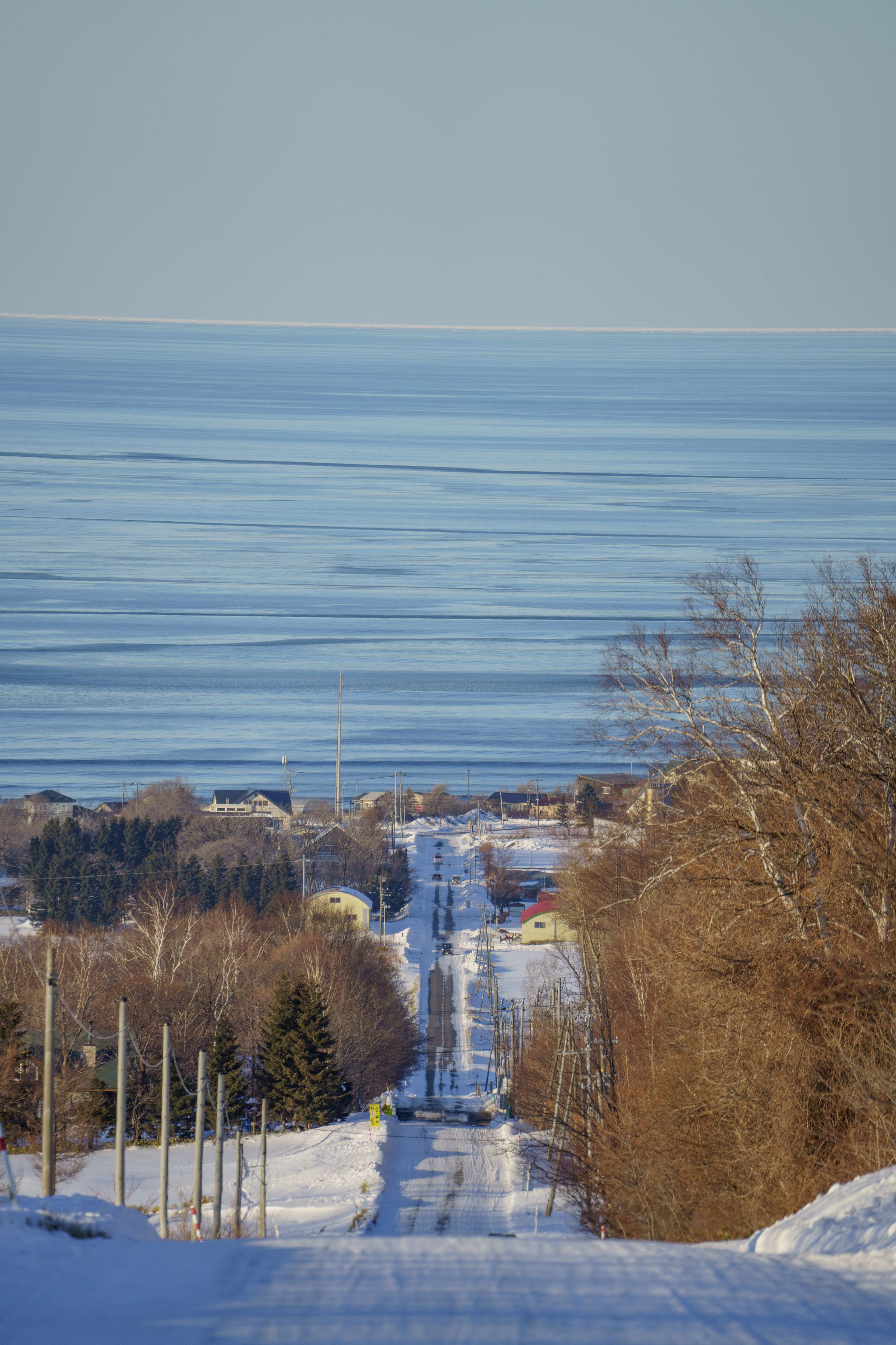 オホーツク海へと続く道。遠くにうっすら白く見えるのは流氷です。