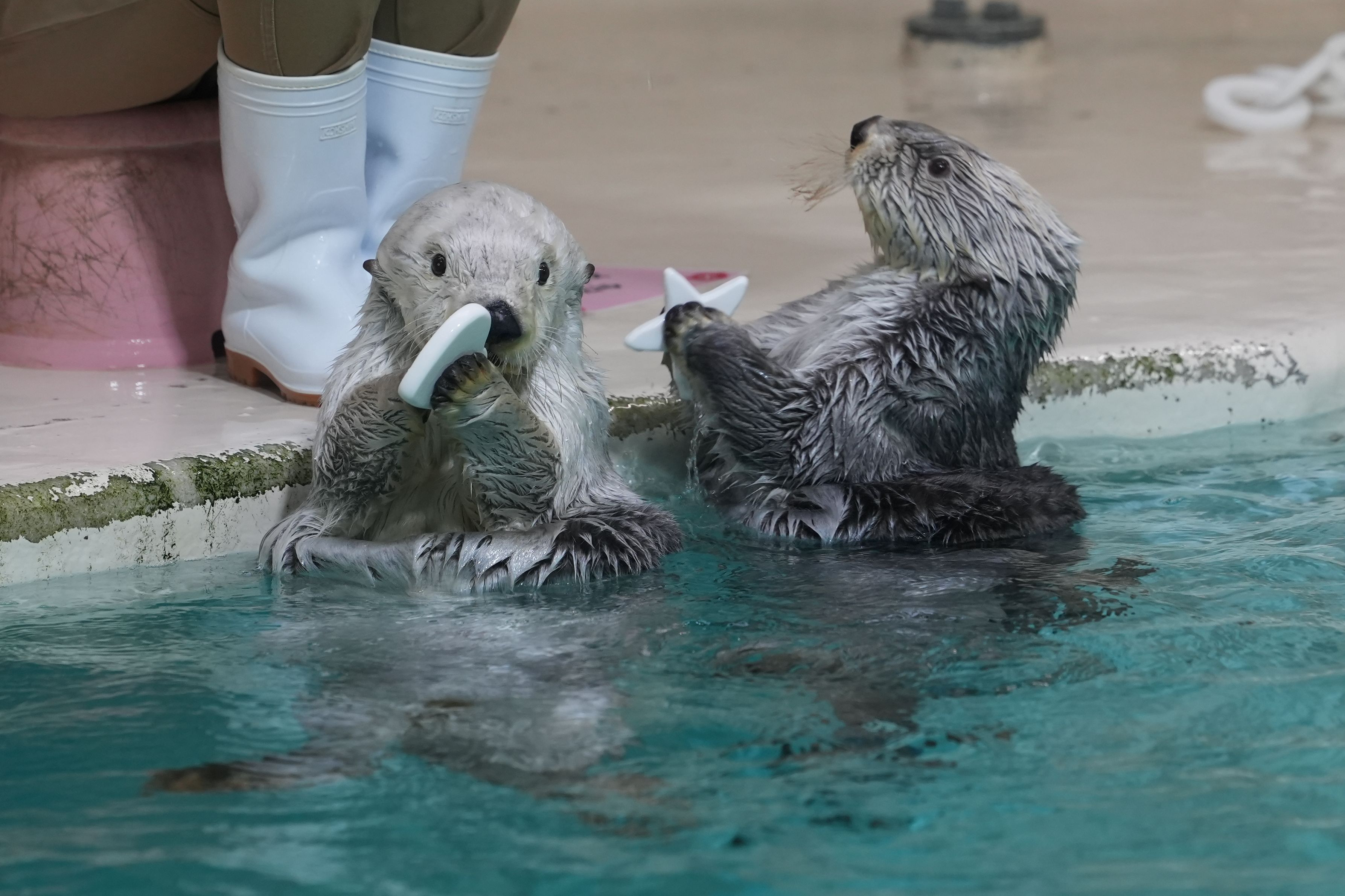 ハートと星の形をしたおもちゃを貰うラッコ達