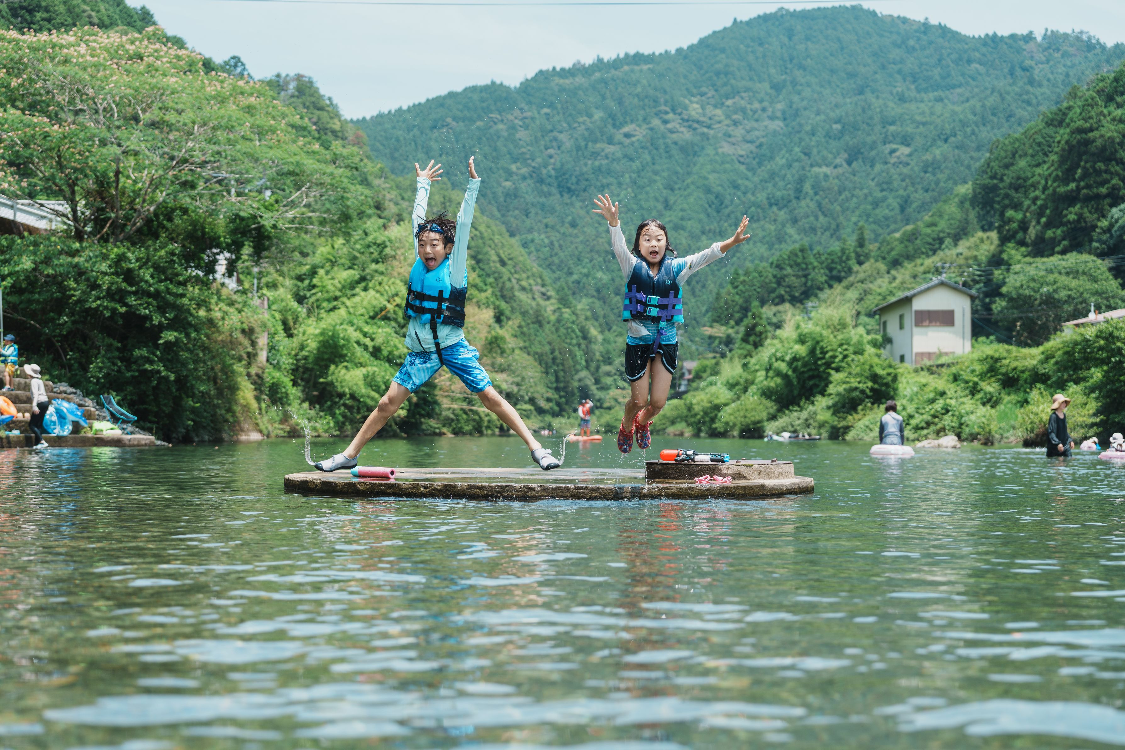 緑あふれる山々に囲まれた清流で、思いっきり空へ飛び出した!ライフジャケットを着て準備万端、恐れを知らない無邪気な冒険心こそが夏の醍醐味。冷たい水に飛び込む爽快感と、キラキラ輝く夏の思い出がぎゅっと詰まってます。
