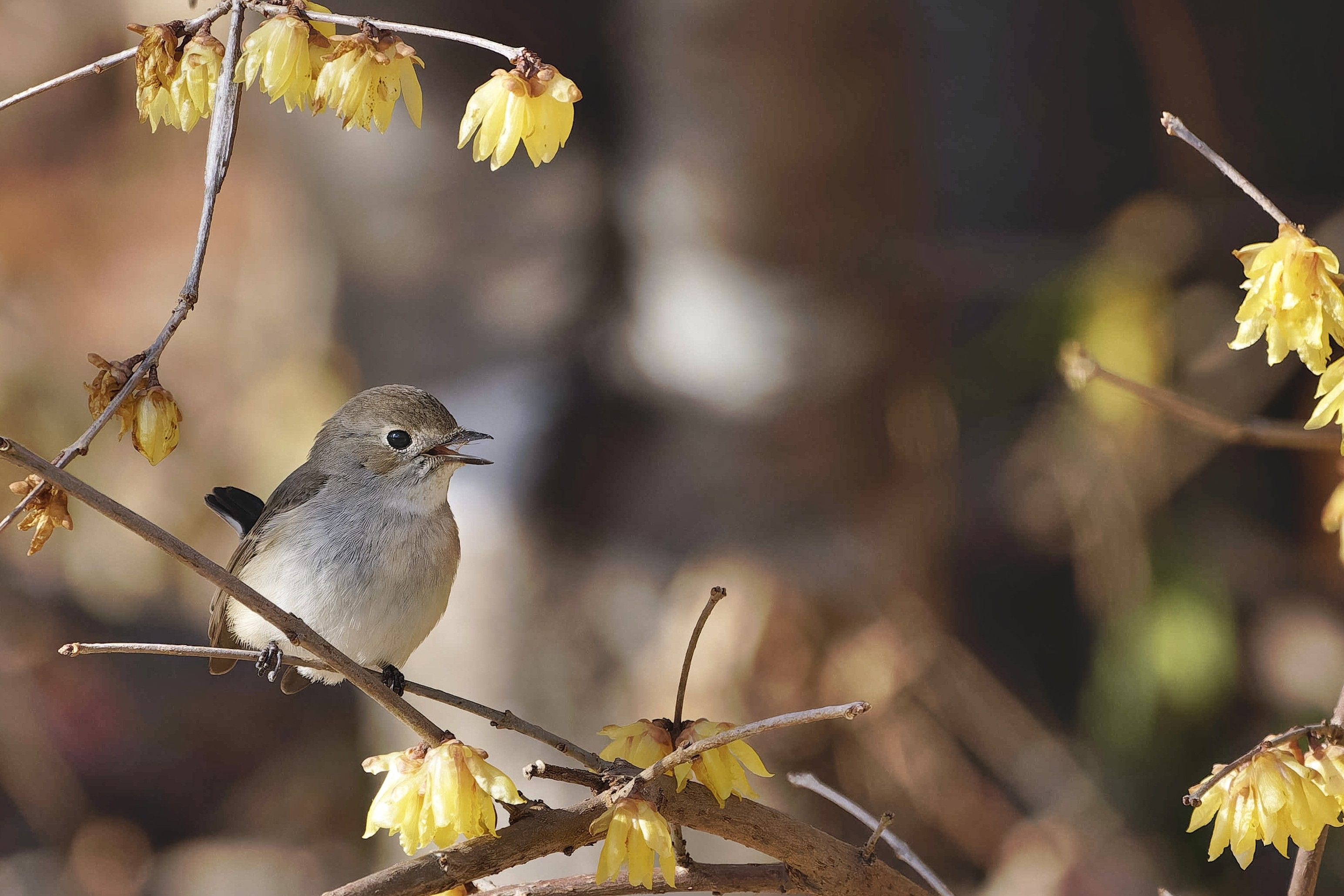 今日も注目の中、オジロビタキはロウバイに来てくれました。