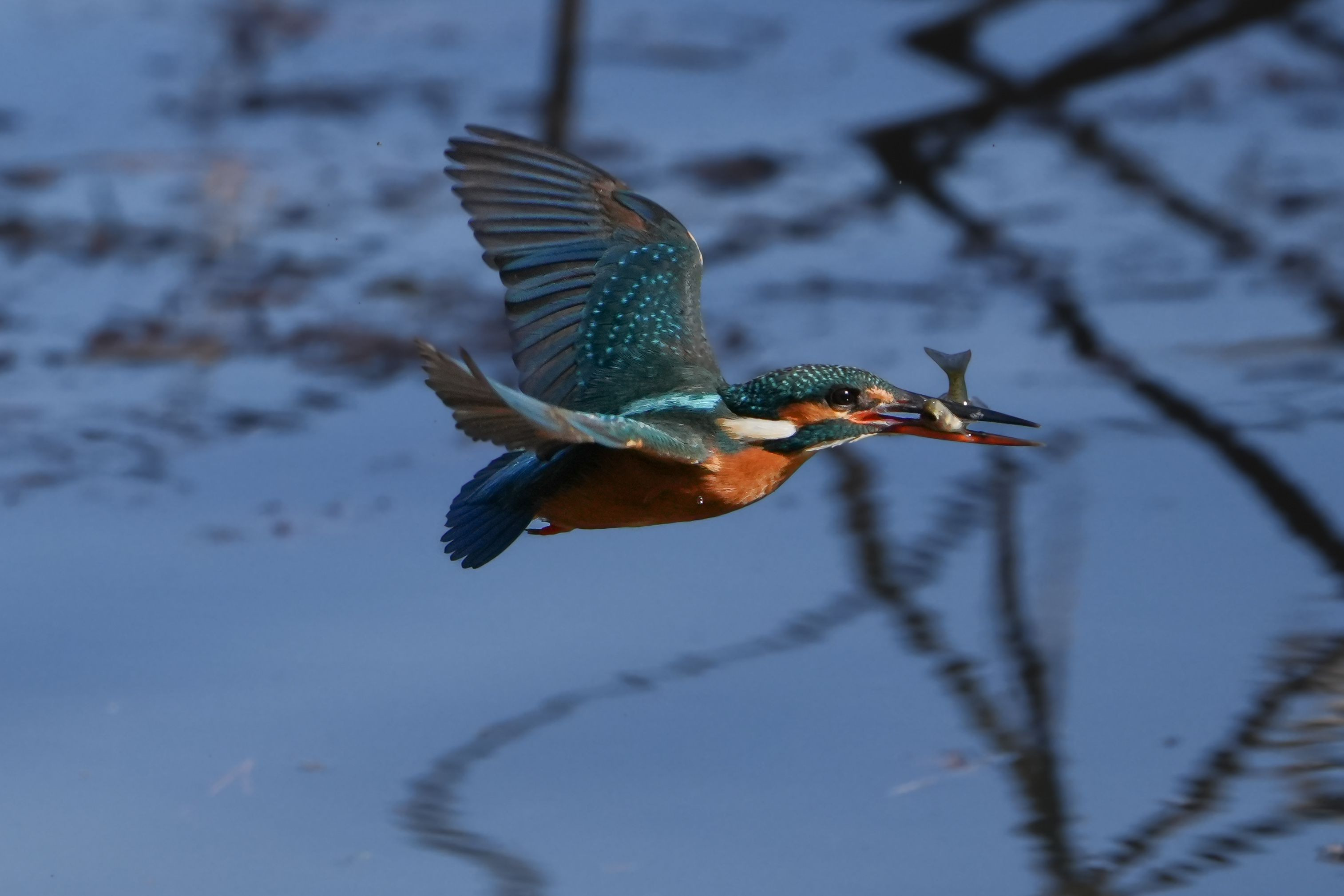 カワセミさん魚をつかみ空気感を感じるような飛翔