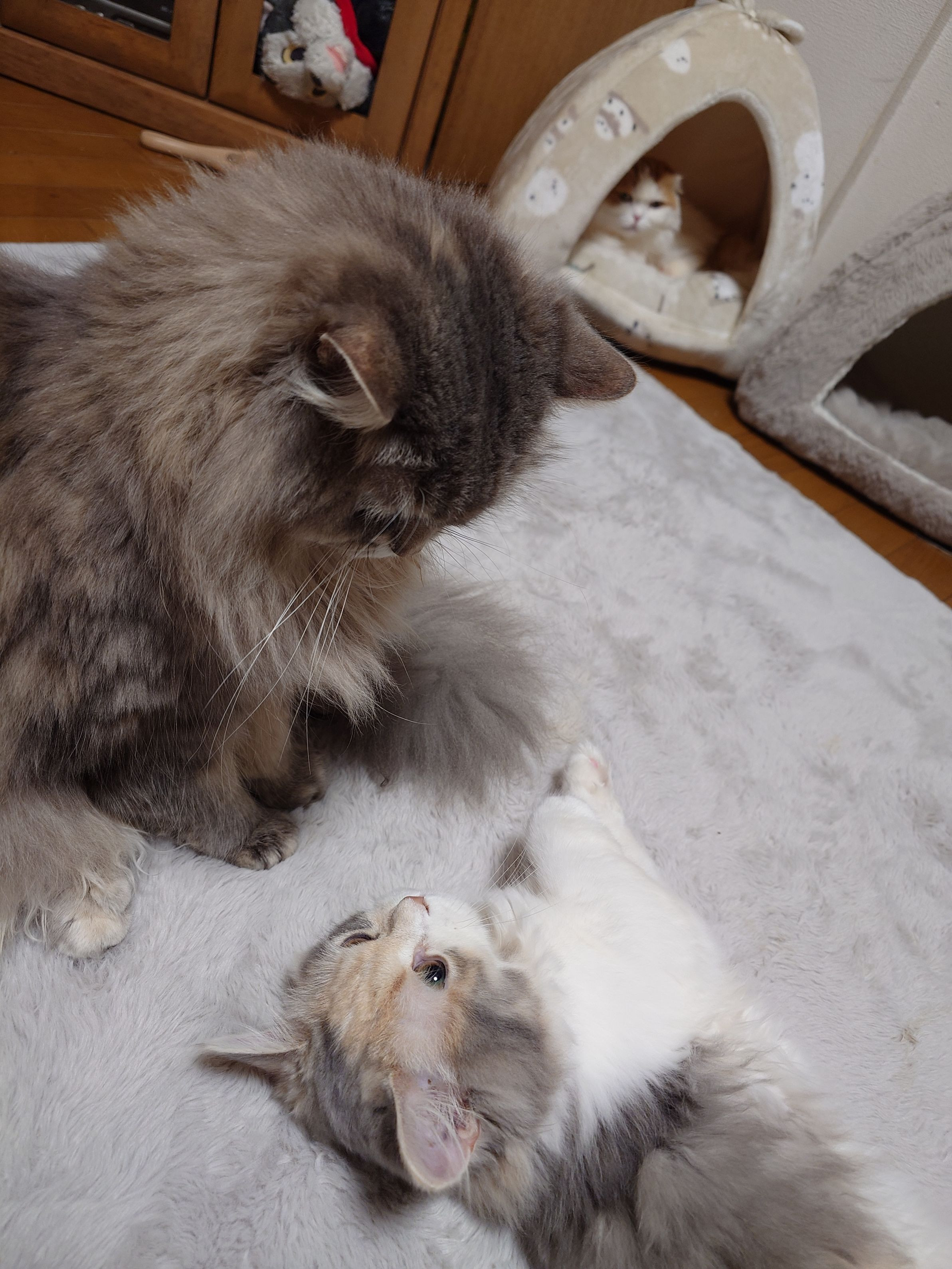 長女に三女が甘えて相手をしてもらっているところを、次女がそっとみまもっている 穏やかな幸せな気持ちでパシャリ