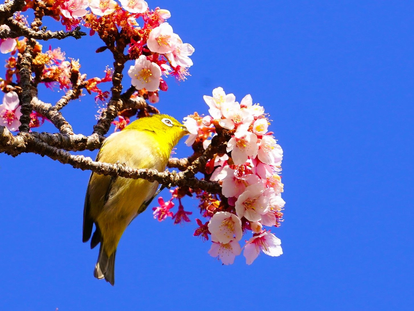カンヒザクラとメジロのつがい
