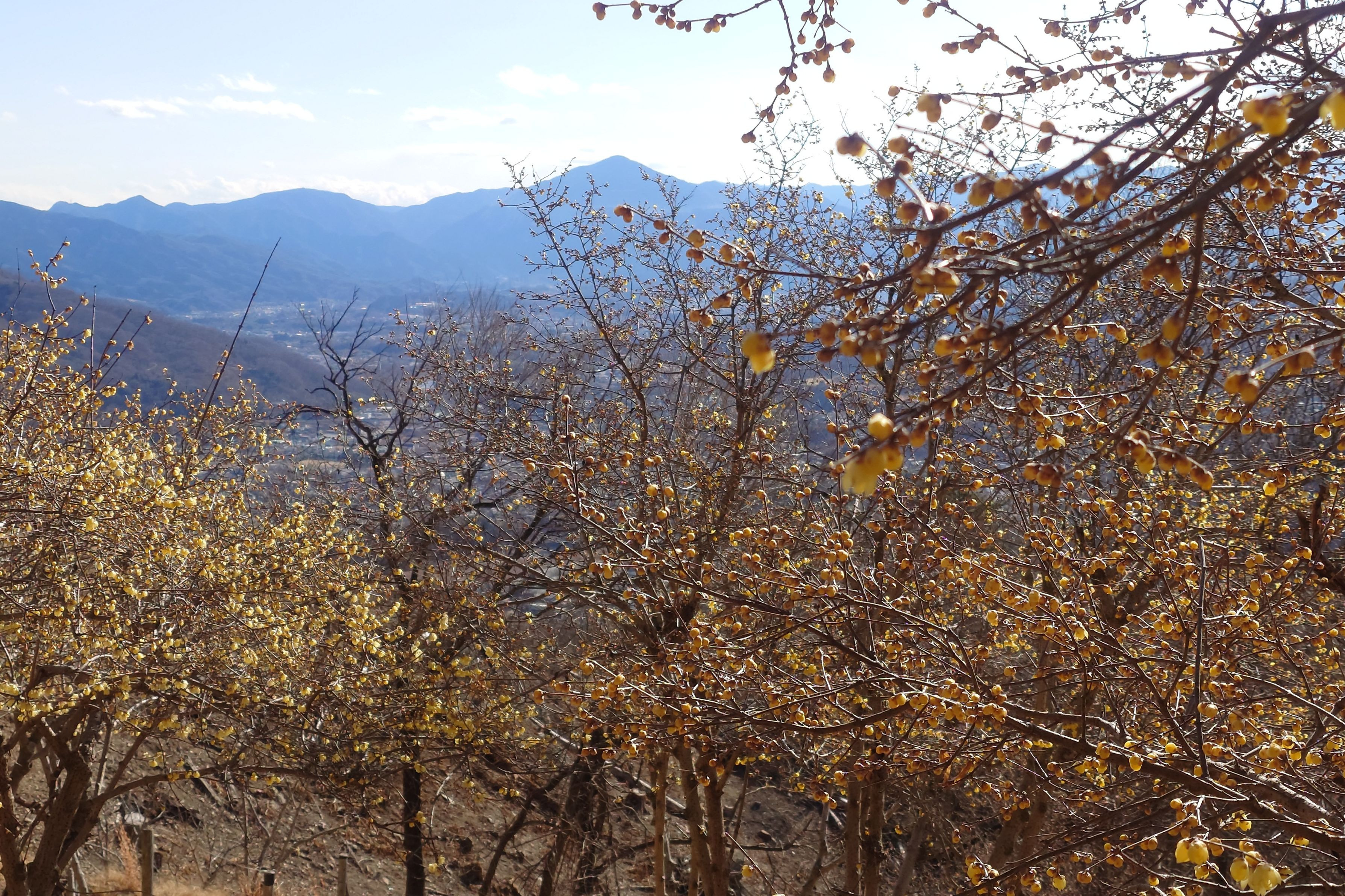 長瀞の宝登山のロウバイです。まだ一部しか咲いていませんでしたが構図を工夫して武甲山と一緒に撮影してみました。
