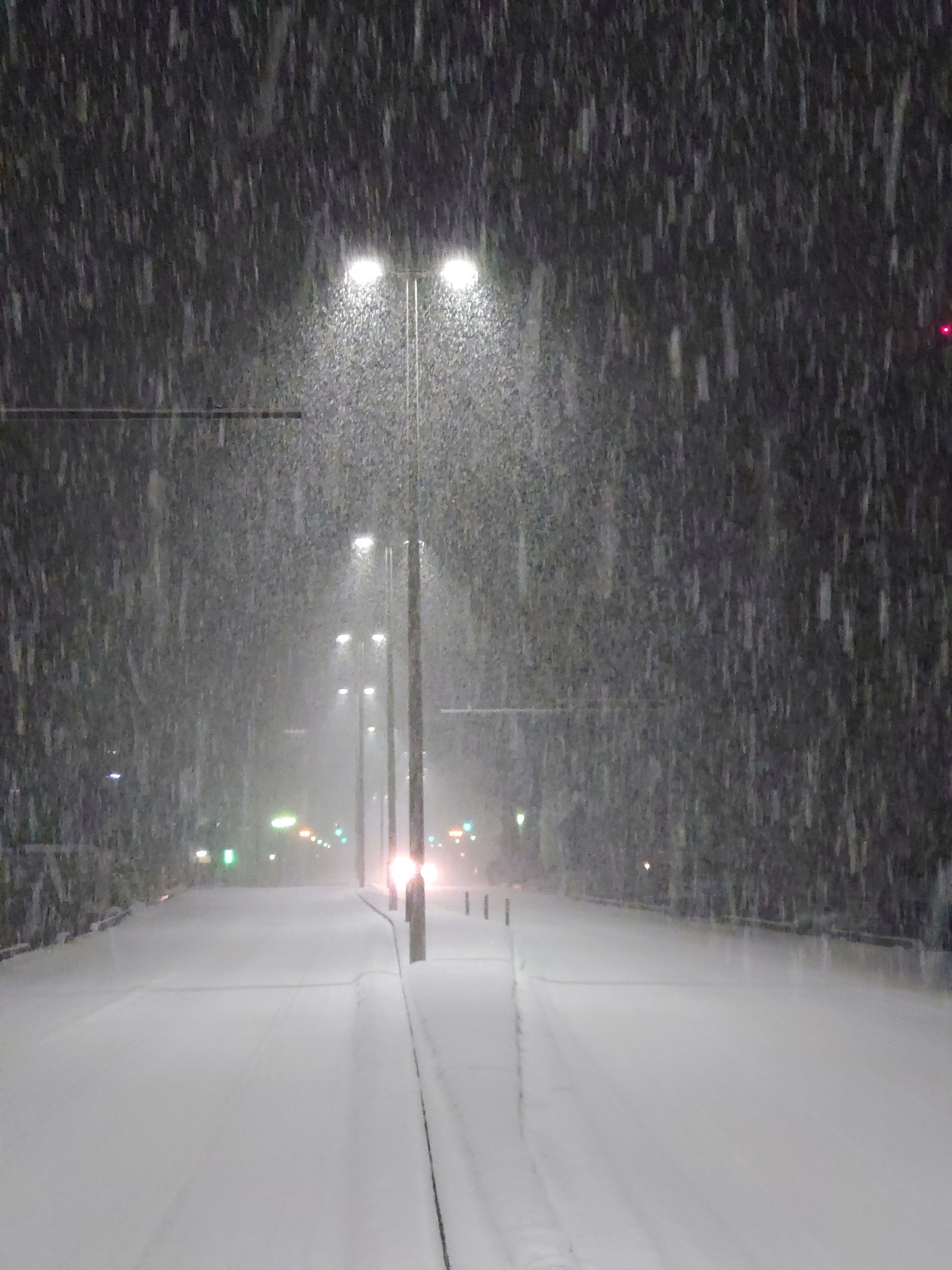 日の出前、雪がしんしんと道路に降り積もるます。