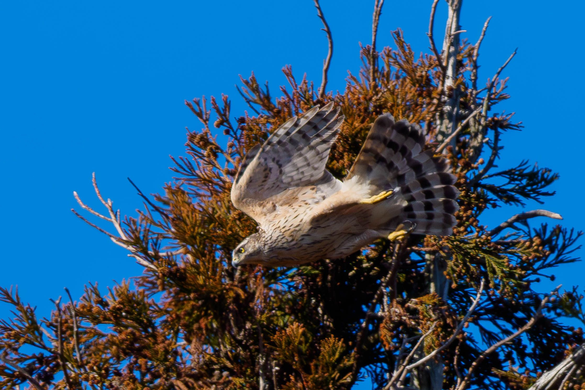 オオタカの幼鳥が高木の枝の手前を羽ばたいているところを撮影しました。