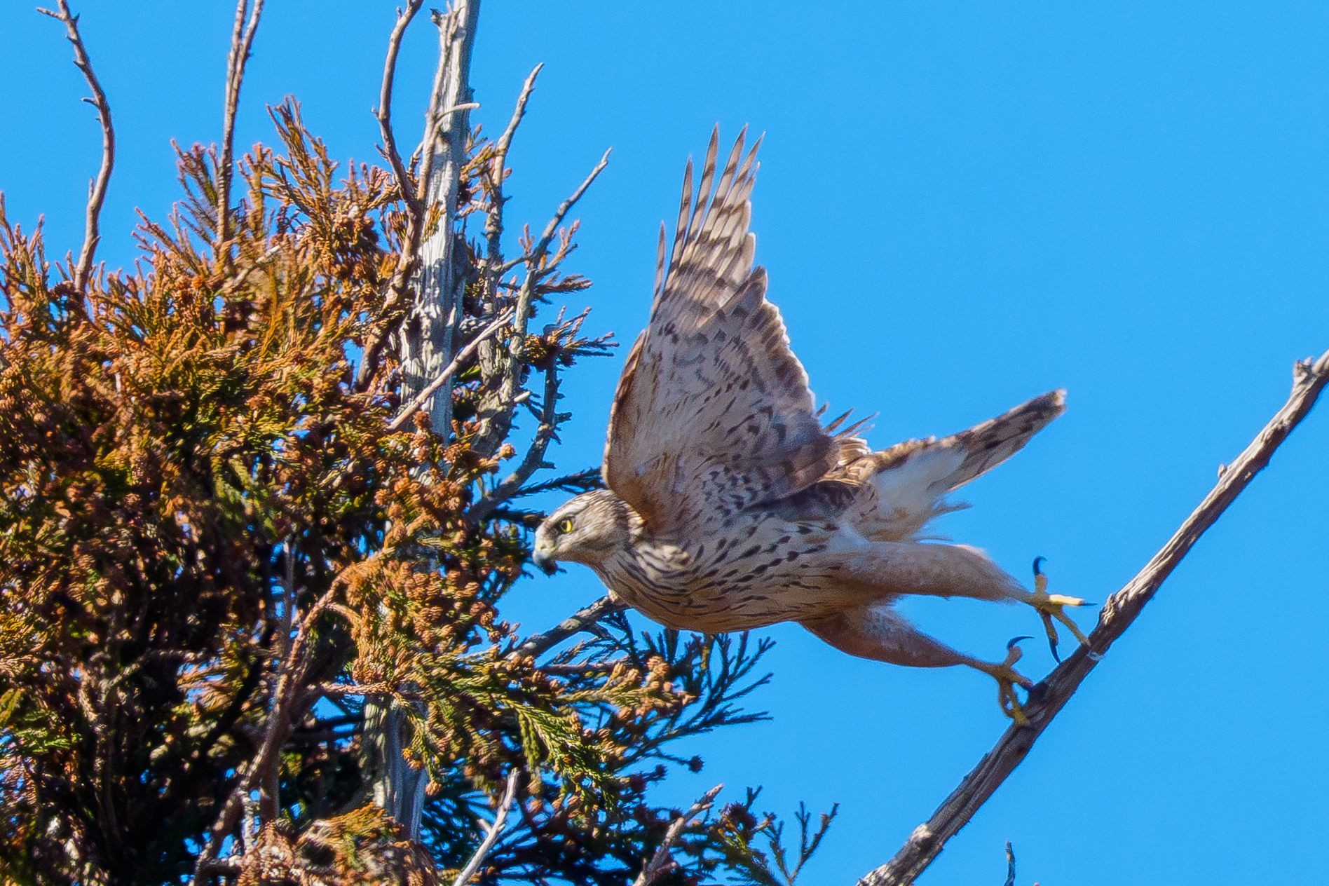 オオタカの幼鳥が高木の枝から飛び立つところを撮影しました。