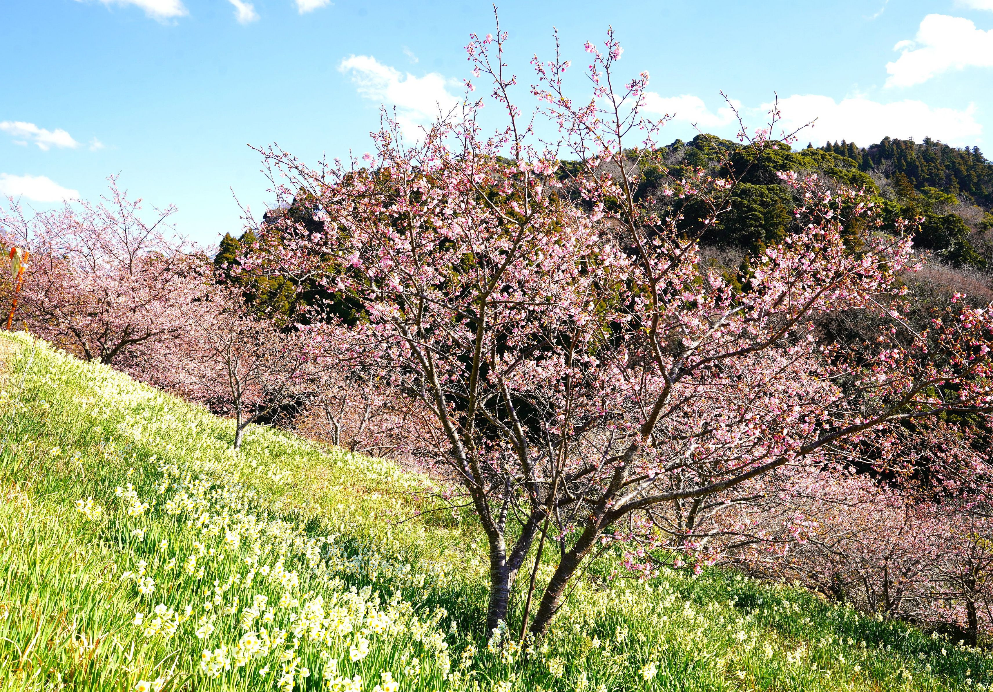 南房総の南斜面に一面に咲き誇る水仙、その中に咲き始めた河津桜