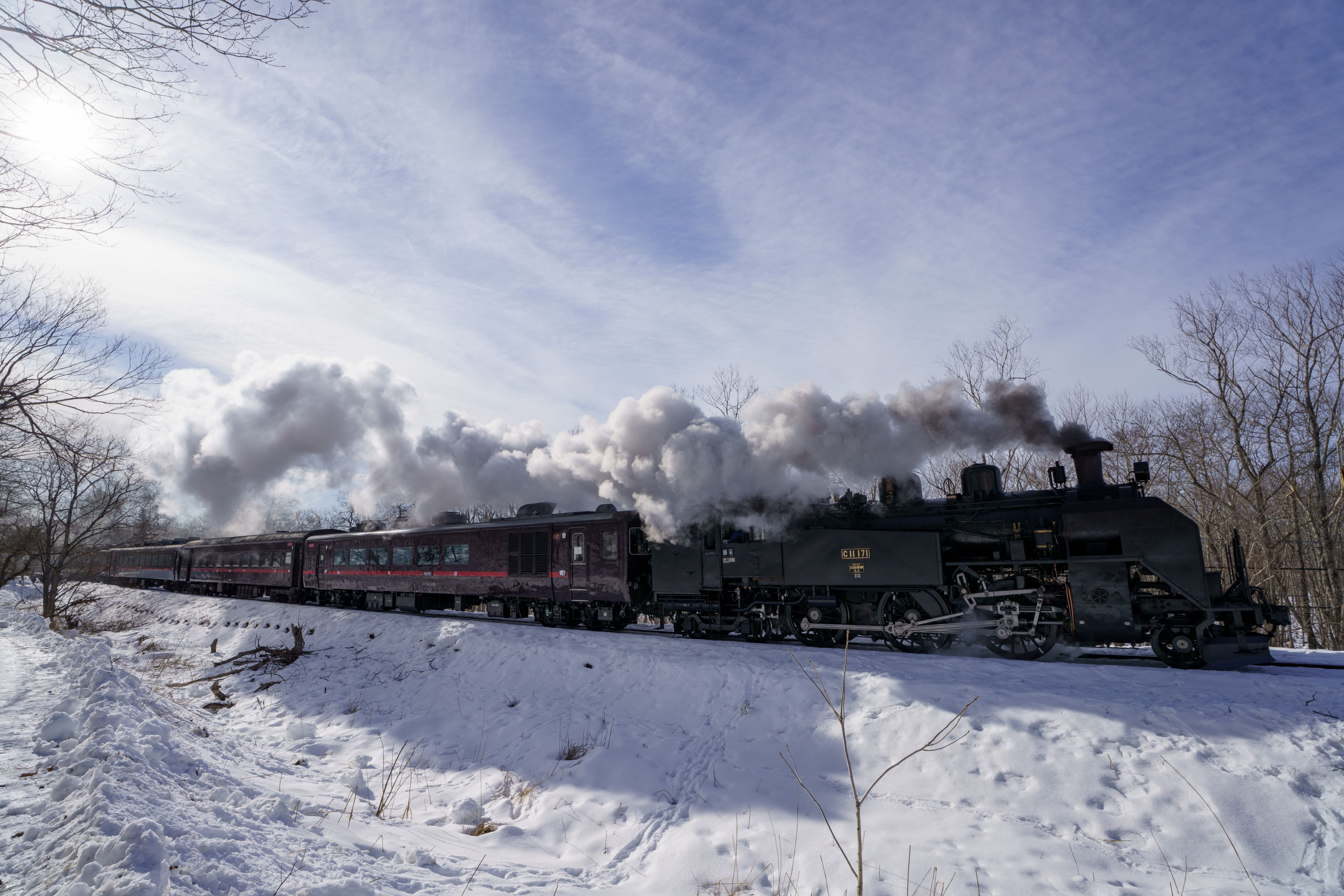 雪の中を行くSL釧路湿原号。広角でその堂々とした姿を捉えてみました。