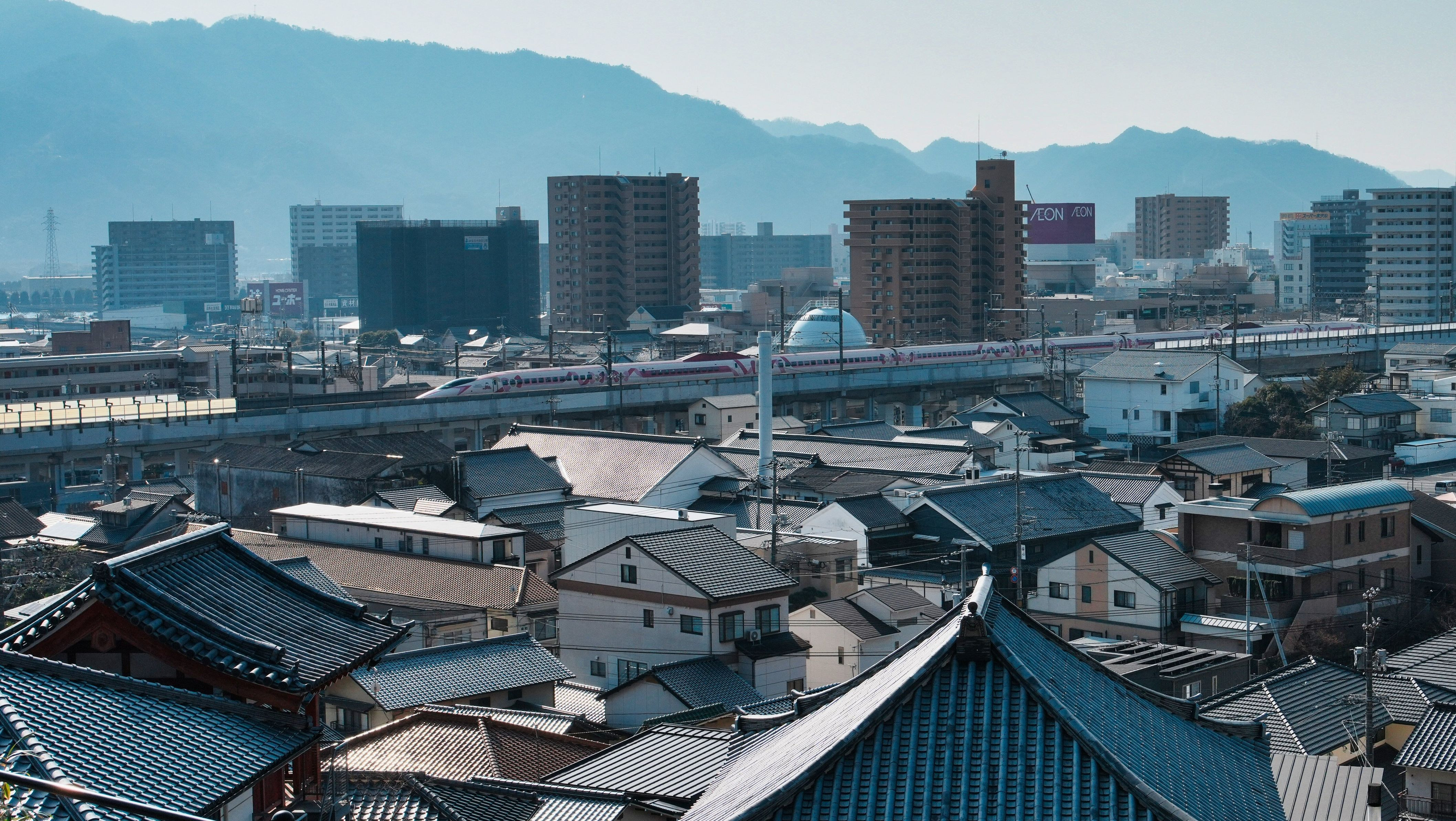高台のお寺の境内から新幹線の高架が良く見えました。ちょうど5月で終了のハローキティー新幹線が見えました。こだまなので三原駅にゆっくり入っていきました。
