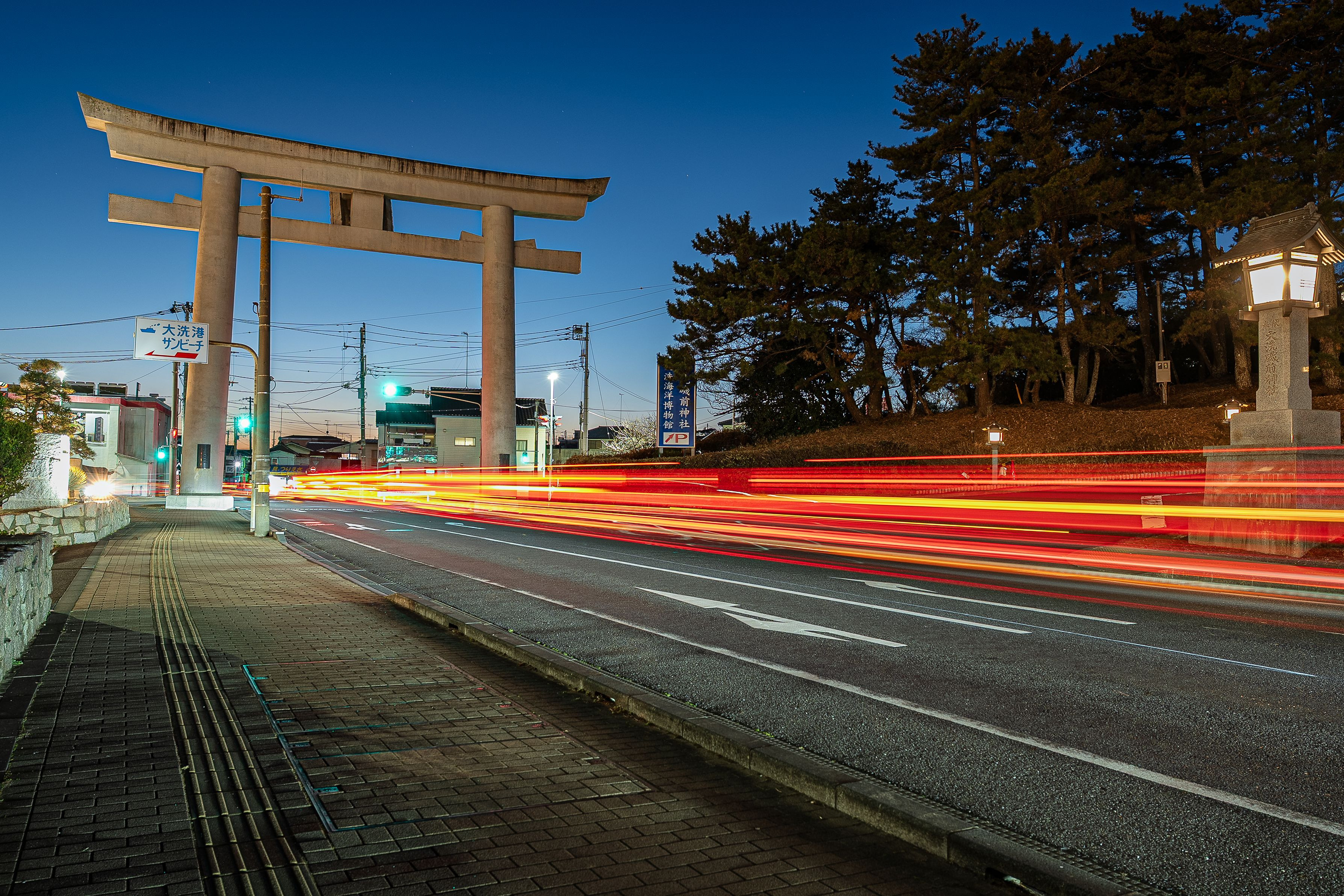 大洗磯前神社の道路上の鳥居です。 長秒露光で鳥居をくぐる車の光跡を撮影してみました。
