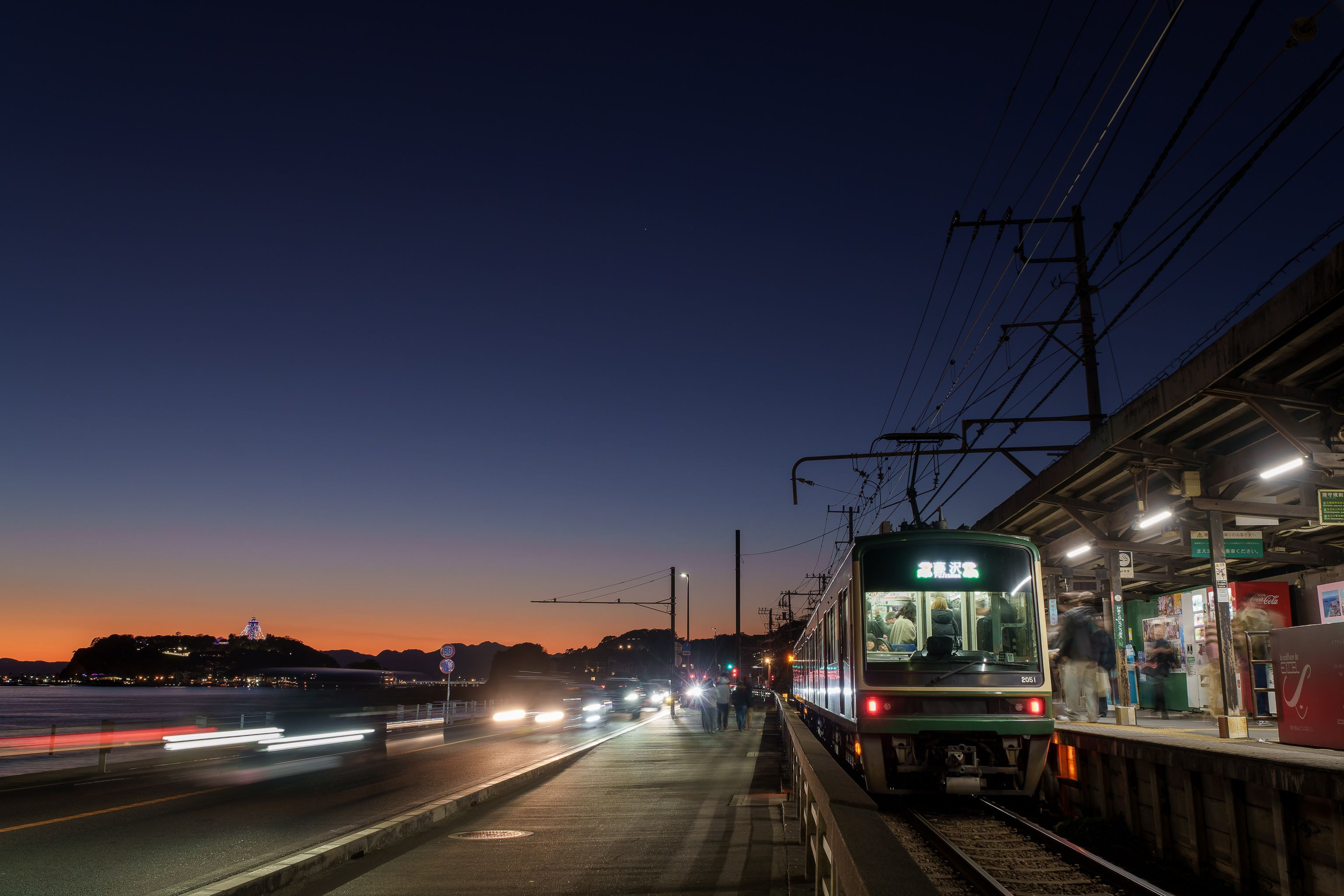 日が沈むと江の島シーキャンドルが点灯されて「湘南の宝石」が始まりました。 #江ノ島電鉄#