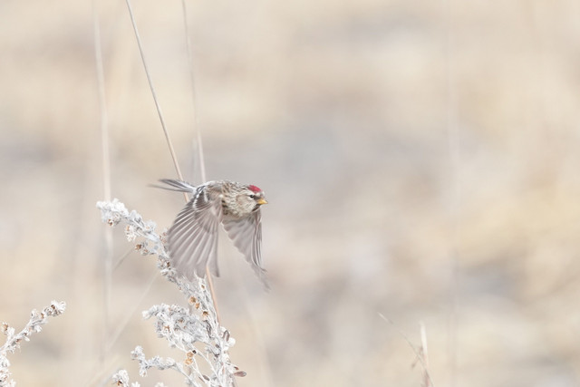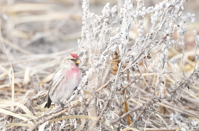 うっすらと雪景色の中でベニヒワの登場です。 前回とは異なるポイントで撮影できました。