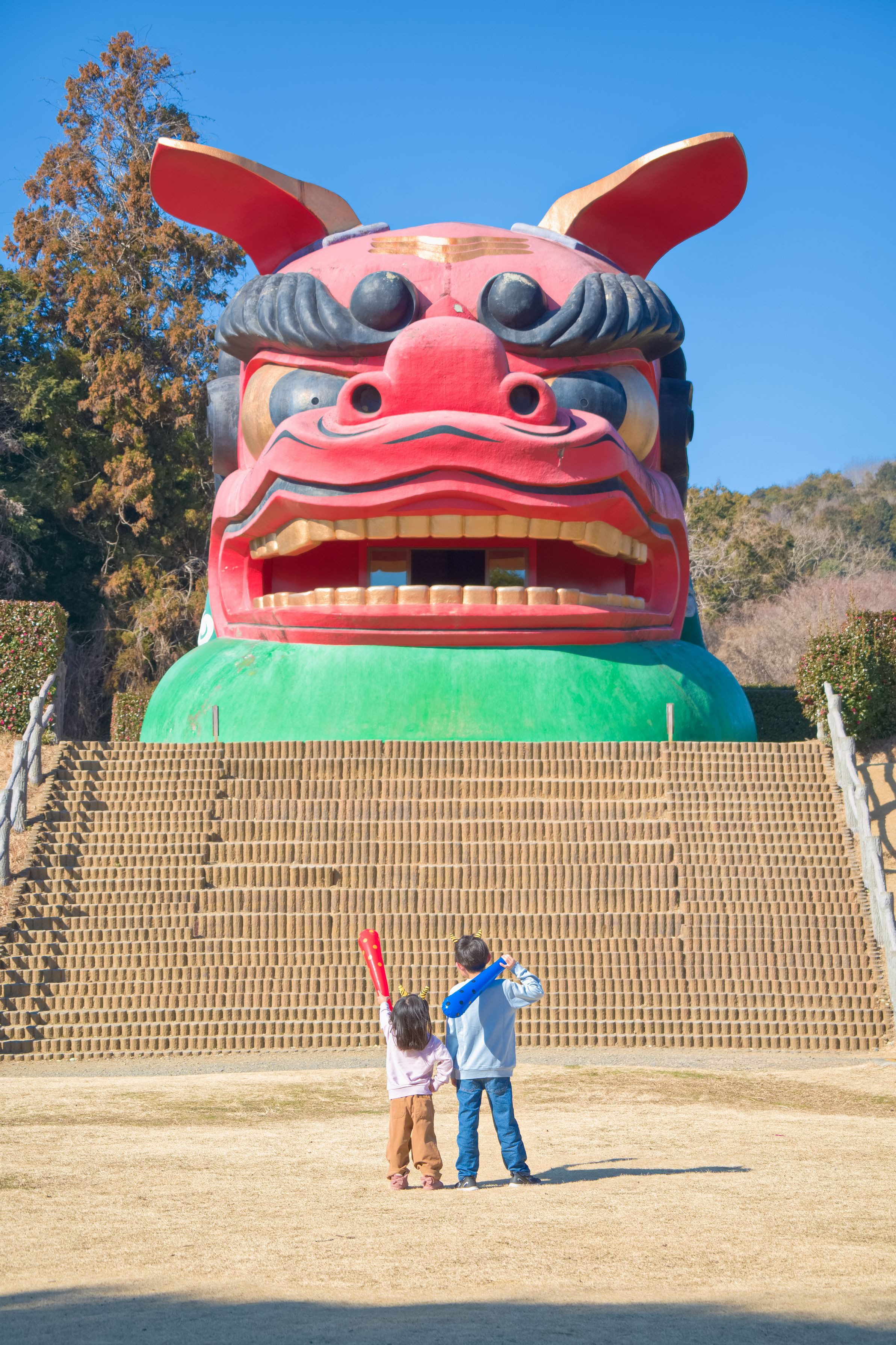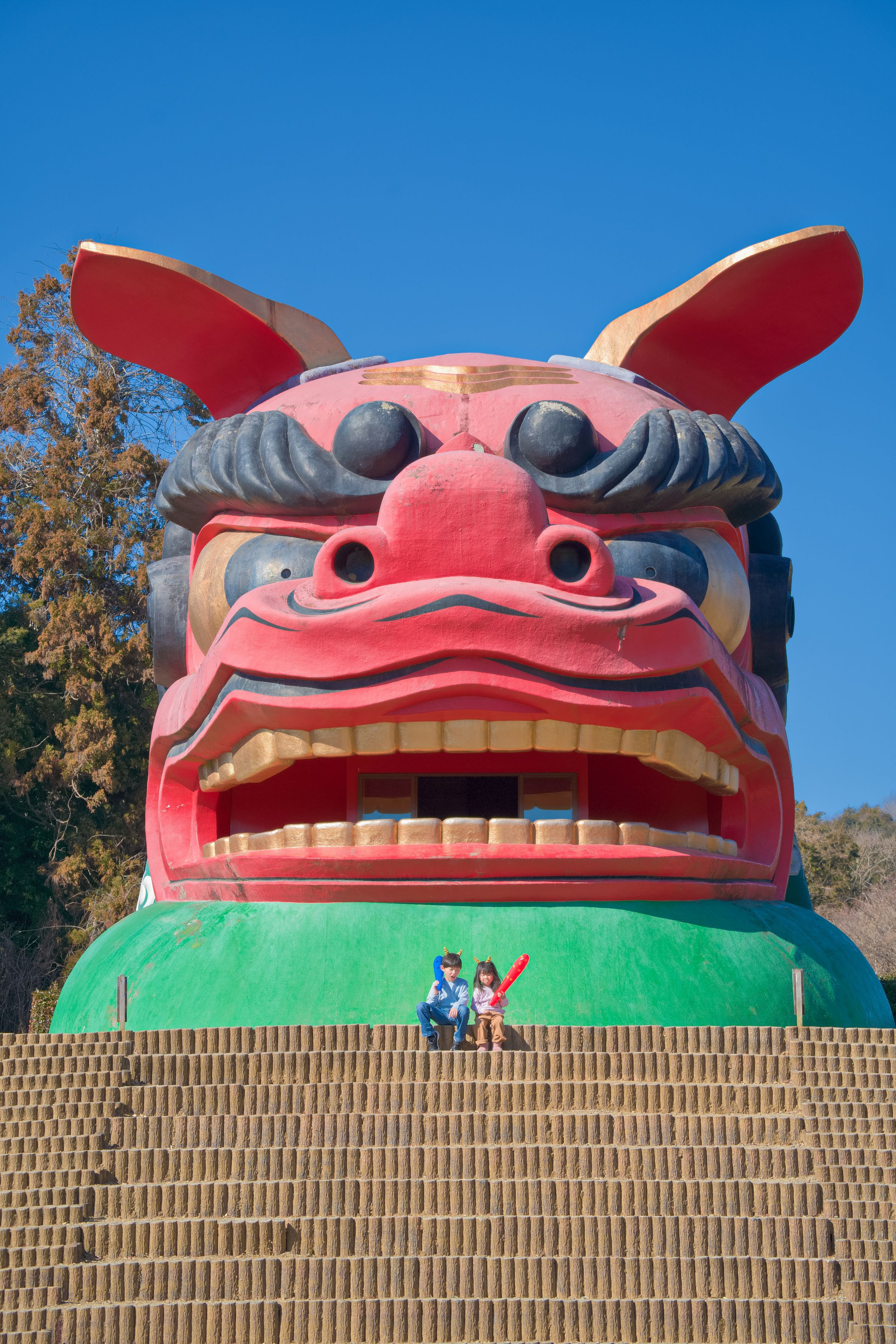 茨城県石岡市の「常陸風土記の丘」にある日本一巨大な獅子頭。高さはなんと14メートルもあります。